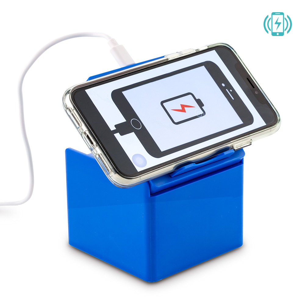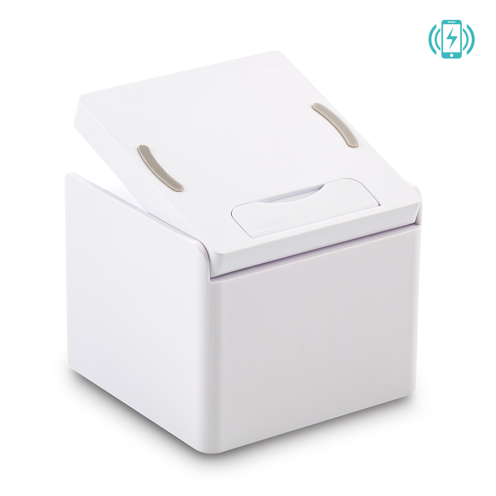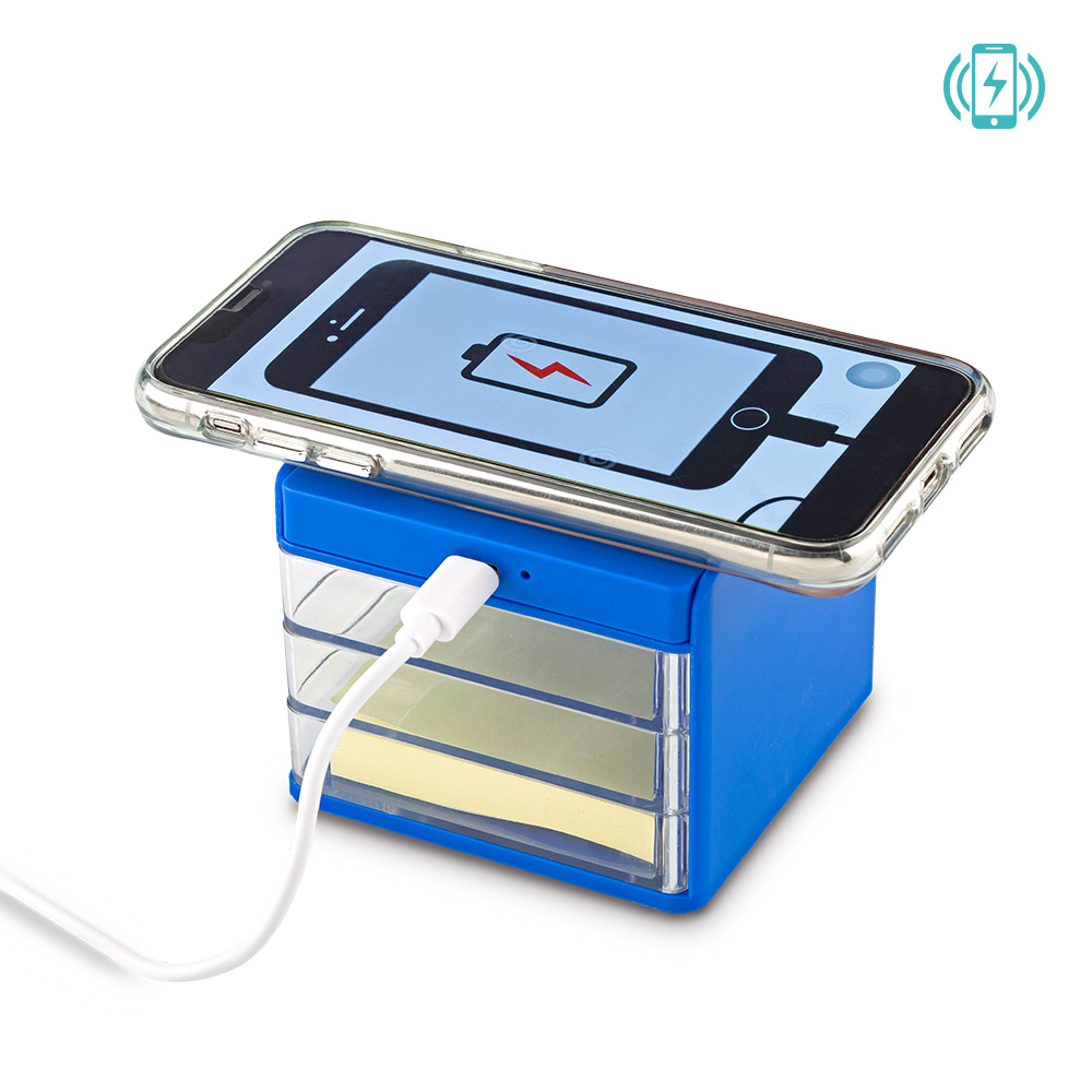 Cargador inalámbrico de 5W, con soporte para celular, tres mini compartimentos, taco de papel y clips. Empaque caja individual.