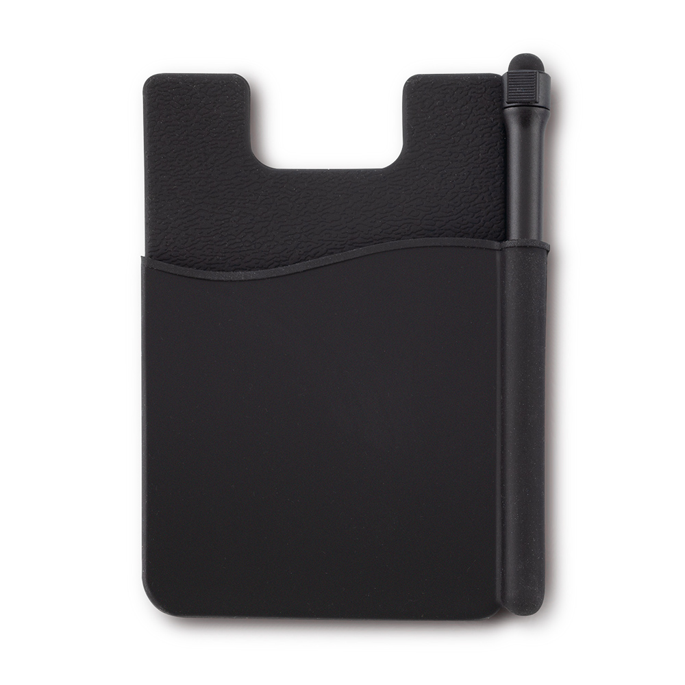 Portatarjetas adhesivo para móviles con mini bolígrafo y stylus incorporado.