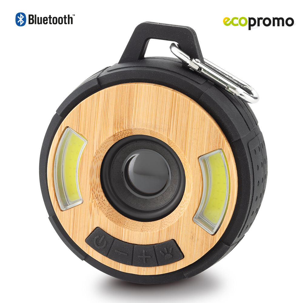 Speaker Bluetooth en caucho y bambú.1x3W con luz COB de 3 modos. Carabinero para cargar. Empaque caja individual.