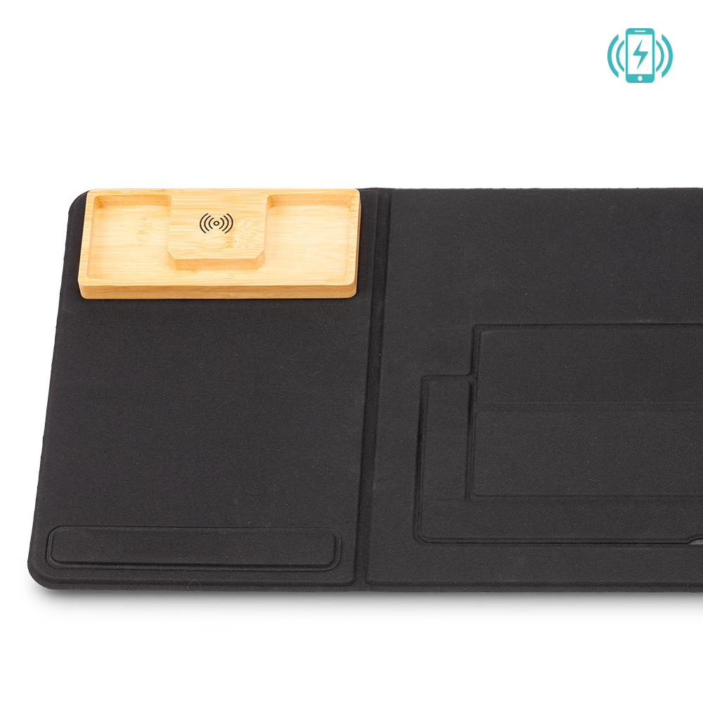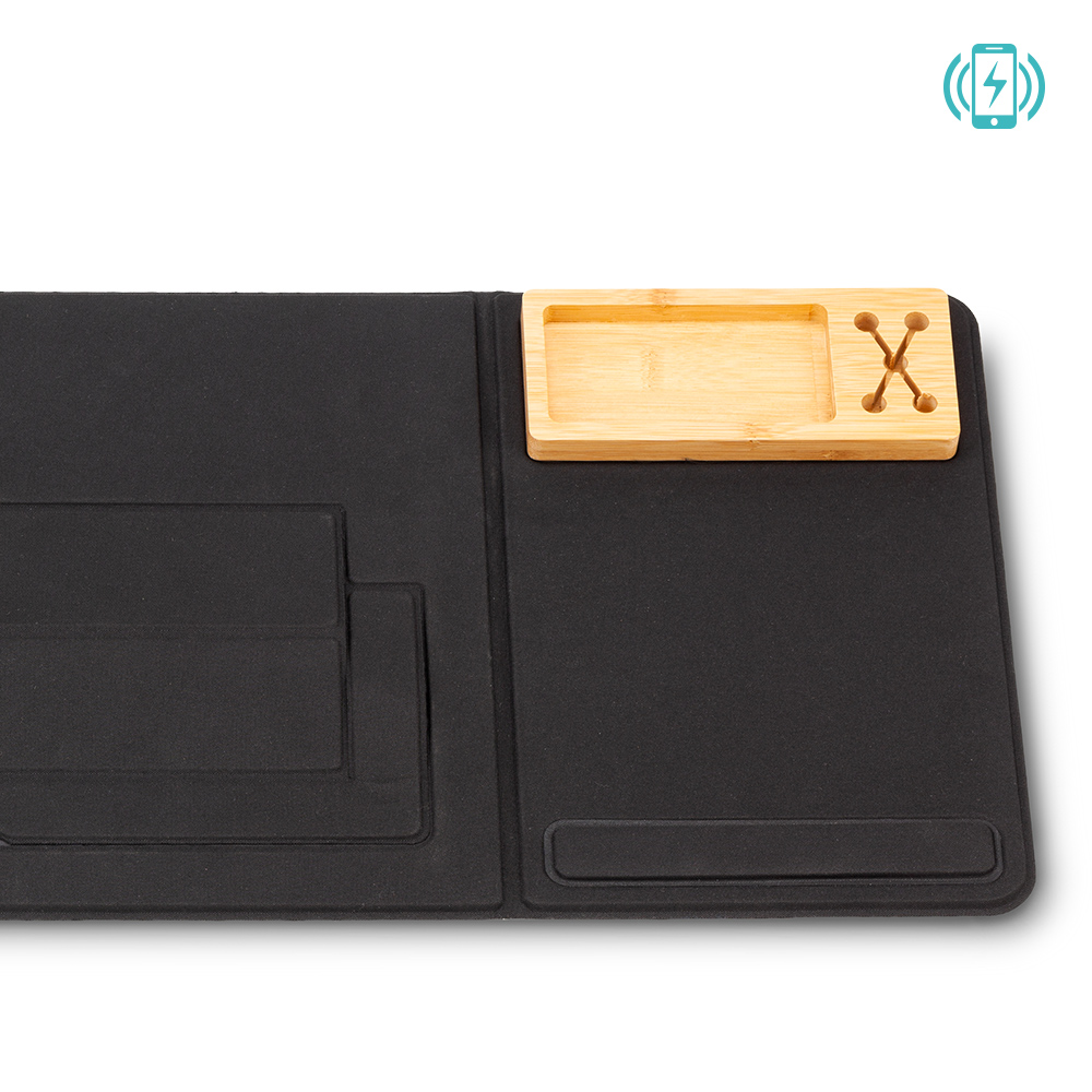 Estación portátil de trabajo plegable, con soporte para laptop de hasta 14, mouse pad, cargador inalámbrico y organizador de elementos pequeños.
