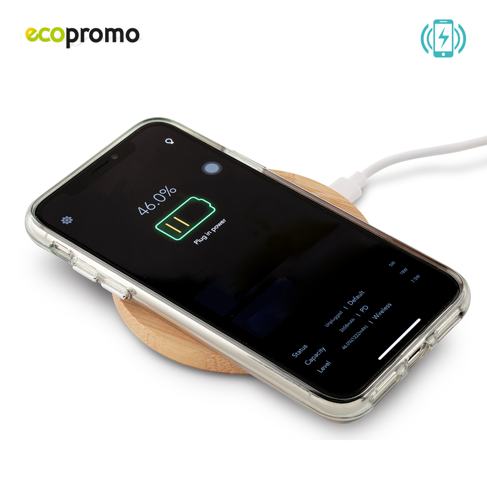 Cargador inalámbrico en bambú de 5W.Input: 5V/2A, Output:5V/1A.