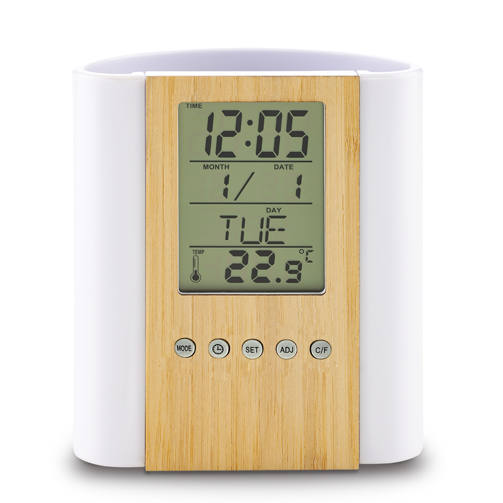 Reloj porta bolígrafo plástico digital con parte frontal en bambú. Empaque Caja Individual.
