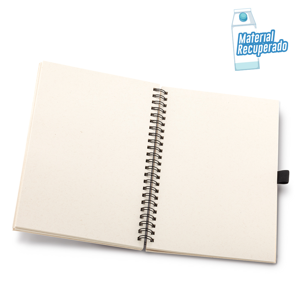 Libreta de 70 hojas con rayas, papel natural de 80g. Papel y cubiertas de cartón elaboradas en material recuperado a partir de cajas de leche.