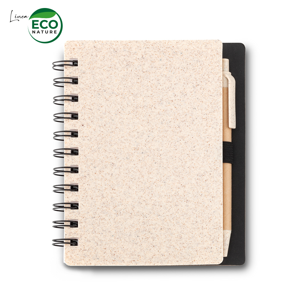 Libreta de 80 hojas de 70g de papel blanco con rayas, cubiertas en partes plásticas con fibra de trigo. Incluye bolígrafo plástico con barril en cartón y partes plásticas con fibra de trigo. Mecanismo push. Mezcla con material ecológico en fibra de trigo (50% aprox). El porcentaje de material ecológico tiene un promedio de biodegradabilidad de 2-3 años después del fin de su vida útil.