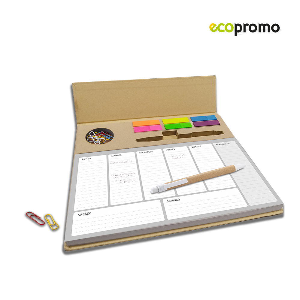 Planeador ecológico. Tapa dura con 100 hojas aprox. Incluye clips surtidos, bolígrafo y juego de 6 stickies de colores plásticos.