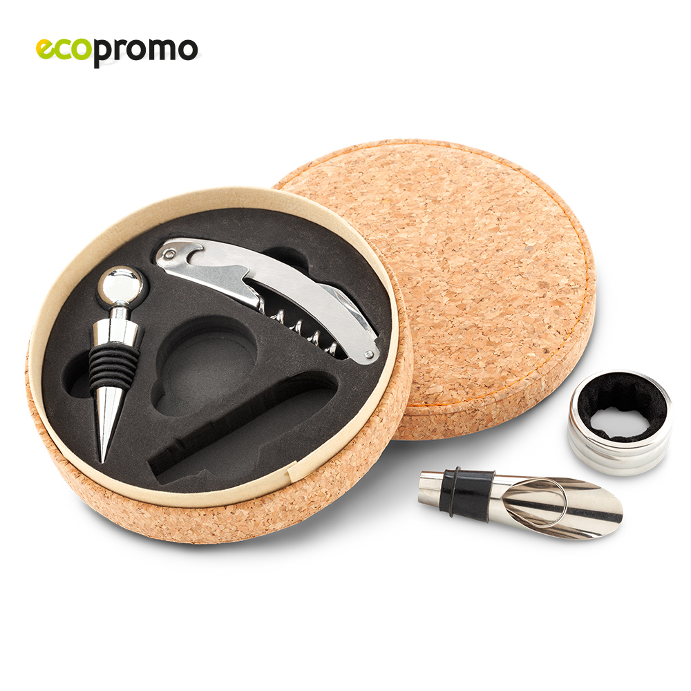 Estuche rígido en corcho con argolla antigoteo, corcho, boquilla y descorchador con navaja de sierra y destapador. Empaque Caja Individual.