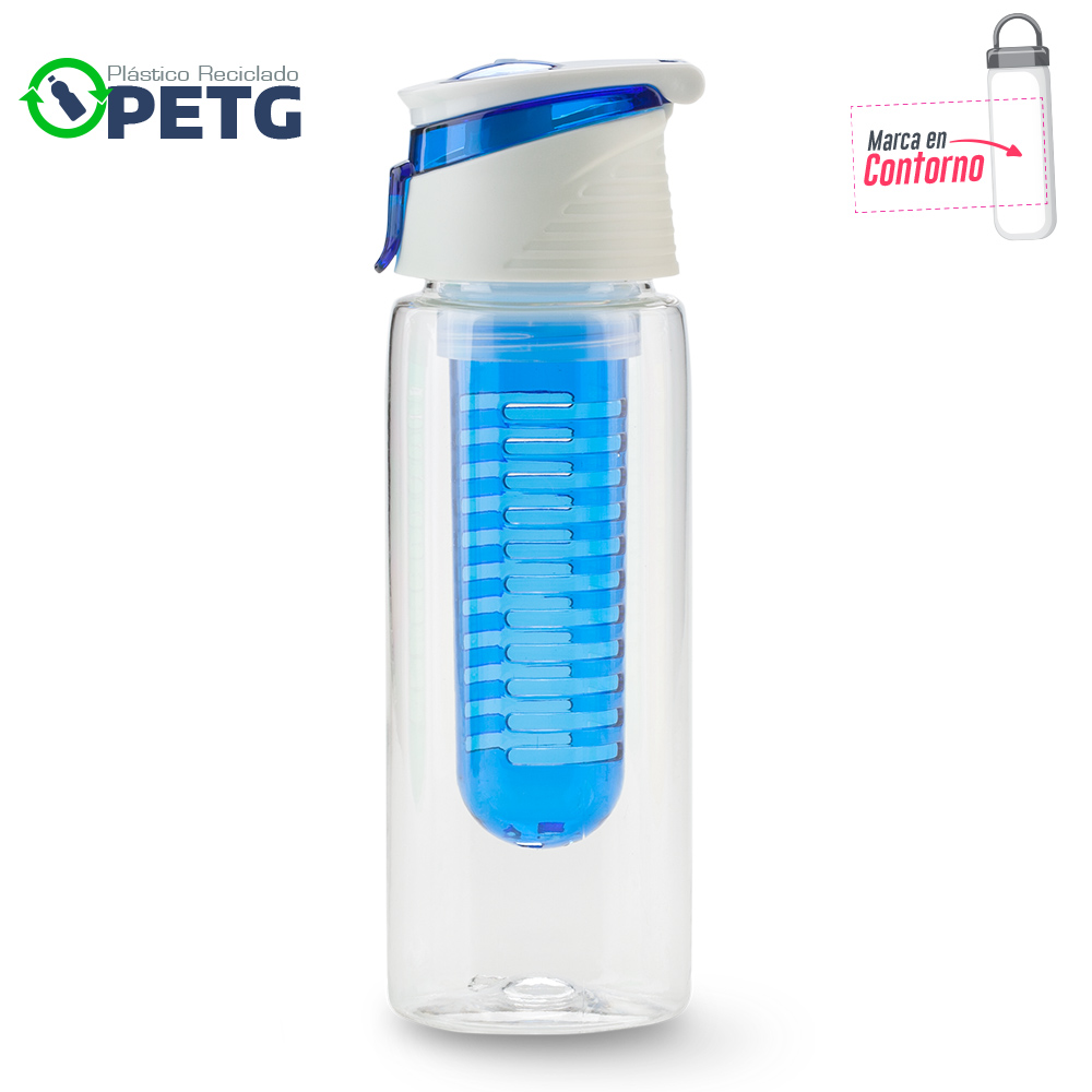 Elaborado en plástico reciclado PETG. Material de alta transparencia, mayor firmeza y durabilidad, libre de BPA, resistente al desgaste e impactos menores y reciclable. Mantiene líquidos tibios hasta 60°C. Con infusor. Tapa pestaña.