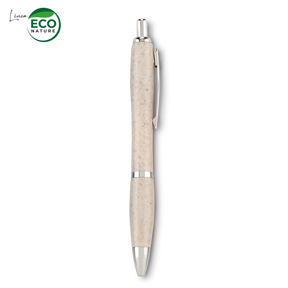 Bolígrafo plástico. Mezcla con material ecológico en fibra de trigo (50% aprox). El porcentaje de material ecológico tiene un promedio de biodegradabilidad de 2-3 años después del fin de su vida útil. Clip metálico. Mecanismo push.