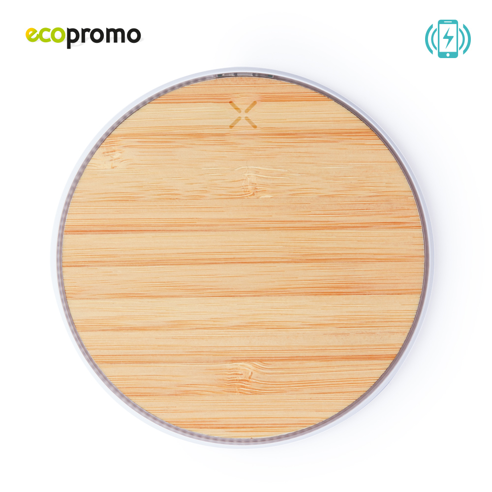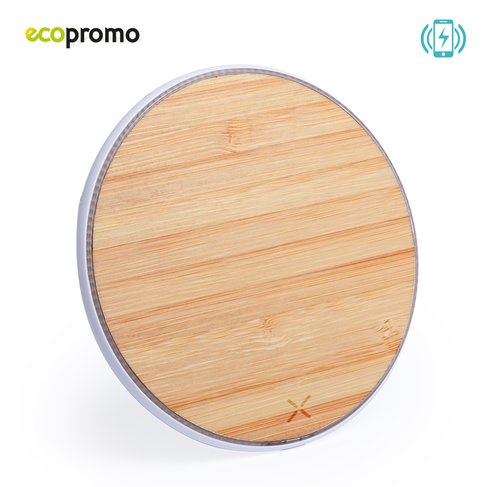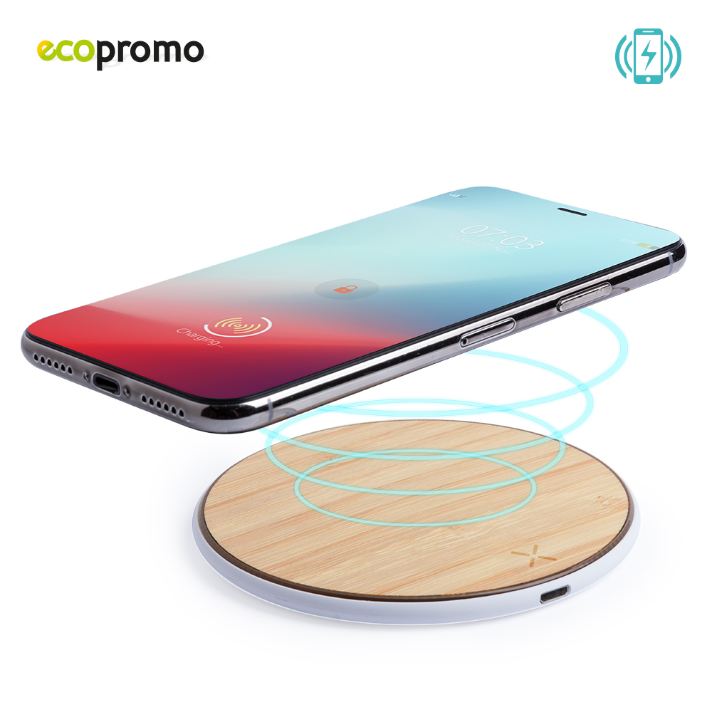 Cargador inalámbrico de línea nature, con base de carga en madera de bambú. Base antideslizante y compatible con dispositivos equipados con tecnología de carga inalámbrica, 5-10W. Input: 5-9V/2-1.67A, Output: 5-9V/1-1.1, cable USB incluido. Empaque Caja Individual.