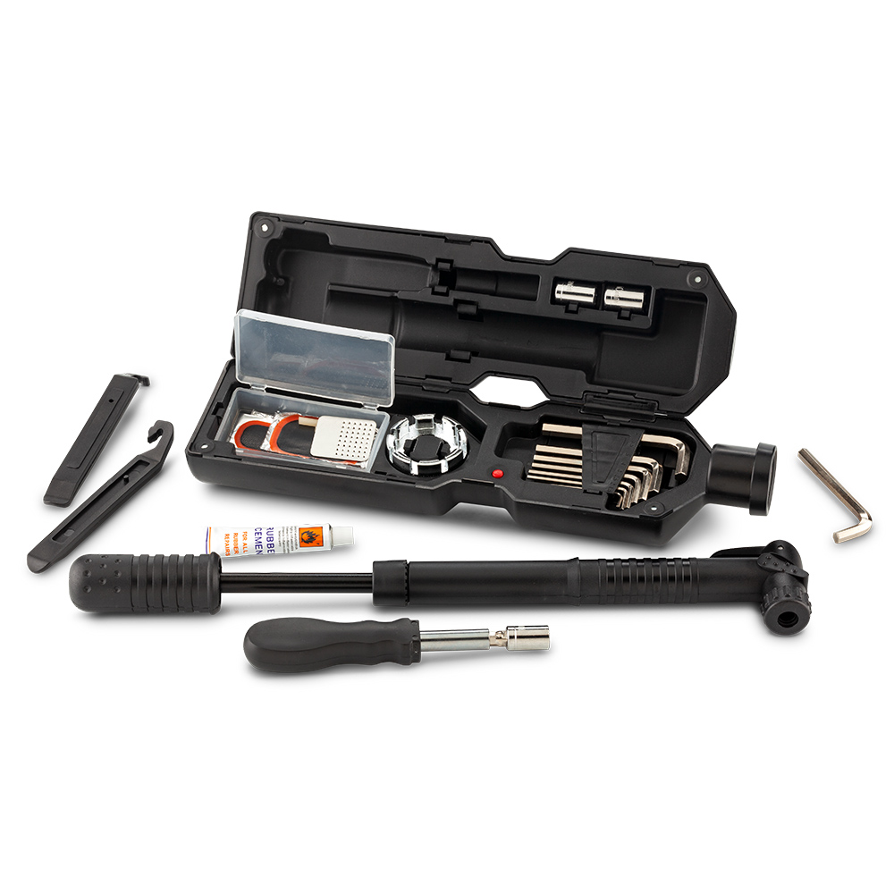 Set de herramientas de 30 piezas para bicicleta, en estuche plástico con linterna, 3 x AAA (baterías no incluidas).
