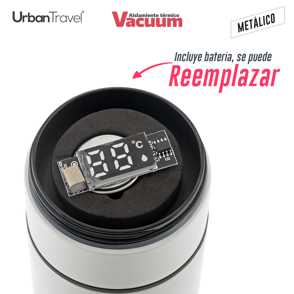 Termo doble pared en acero Inoxidable, con aislamiento térmico que mantiene la bebida fría o caliente hasta 6h, aprox (puede variar dependiendo condiciones climáticas). Tapa con indicador de temperatura del líquido interior que se activa con un toque y filtro metálico interno. Incluye batería la cual se puede reeemplazar. Empaque caja individual.