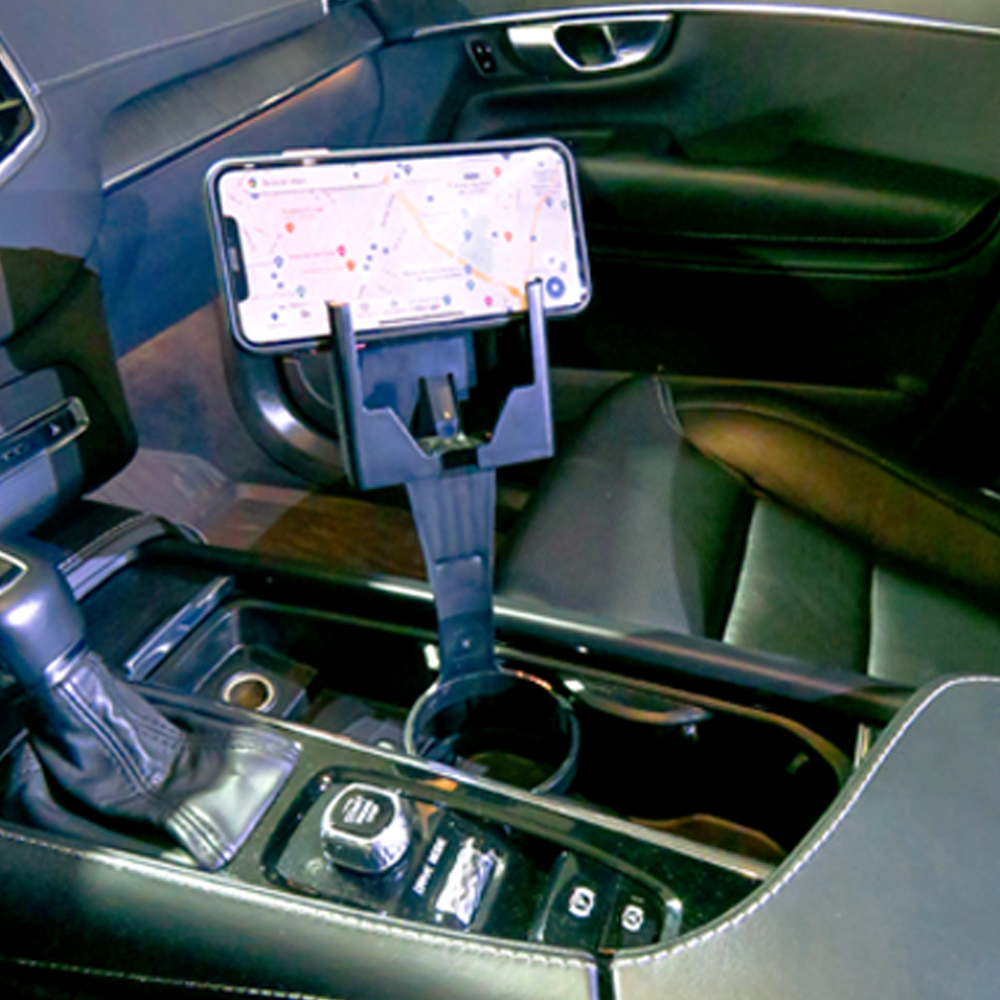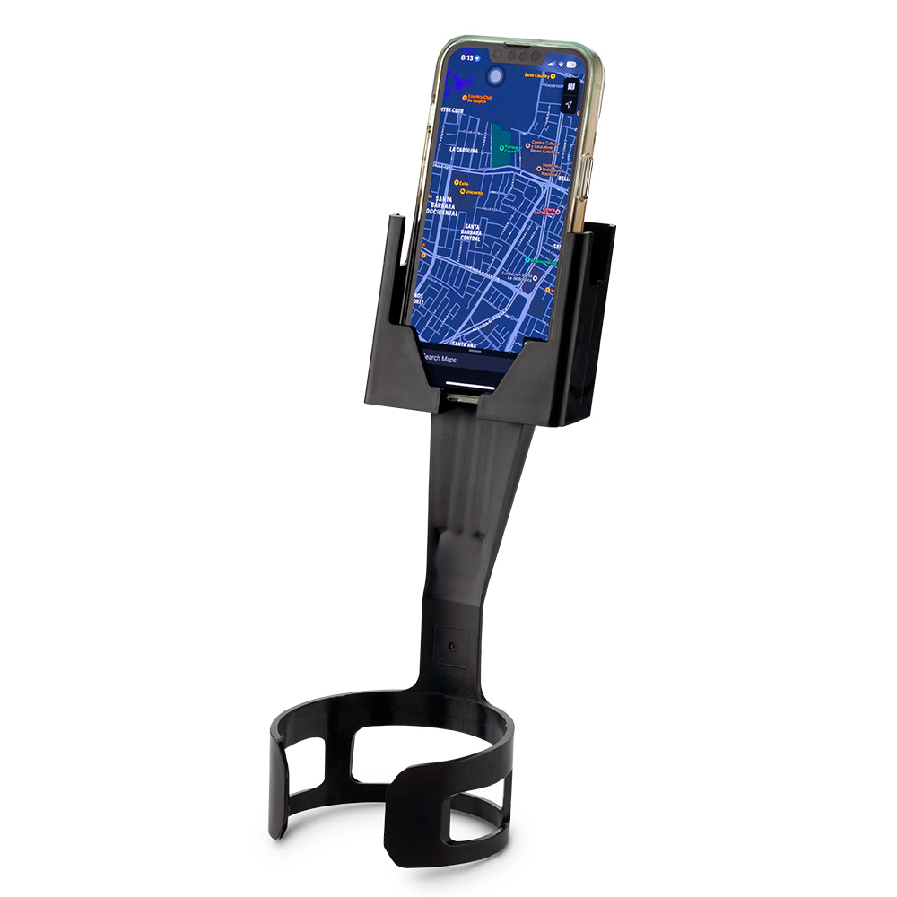 Soporte para móviles en plástico. Parte inferior del soporte se fija en el portavasos del carro. Empaque caja individual.