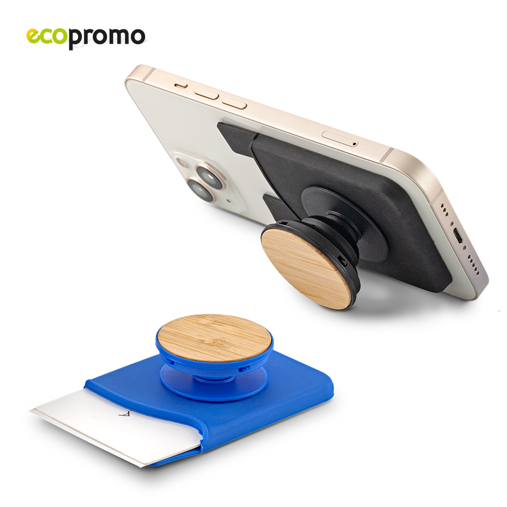 Portatarjetas adhesivo para móviles, con soporte expandible en plástico y bambú, adhesivo tipo 3M. Funciona como soporte u organizador de cable.