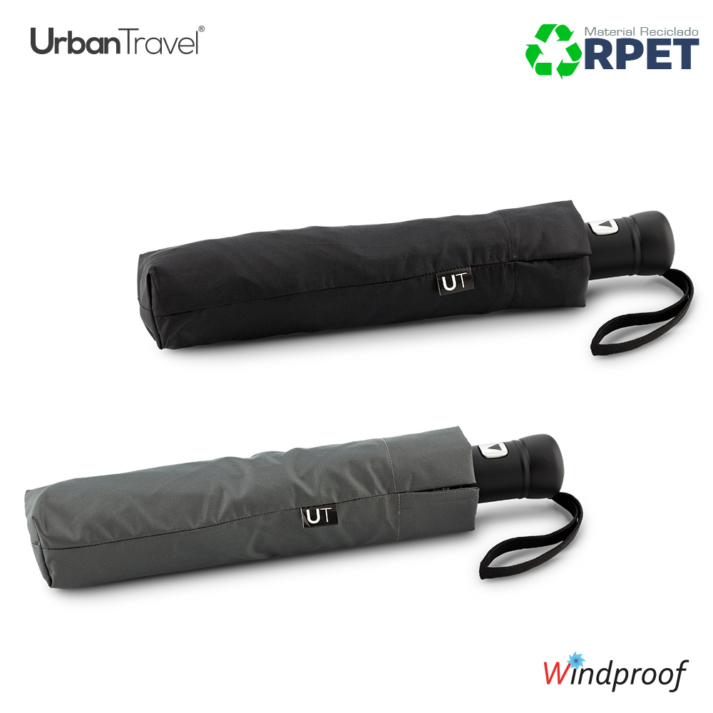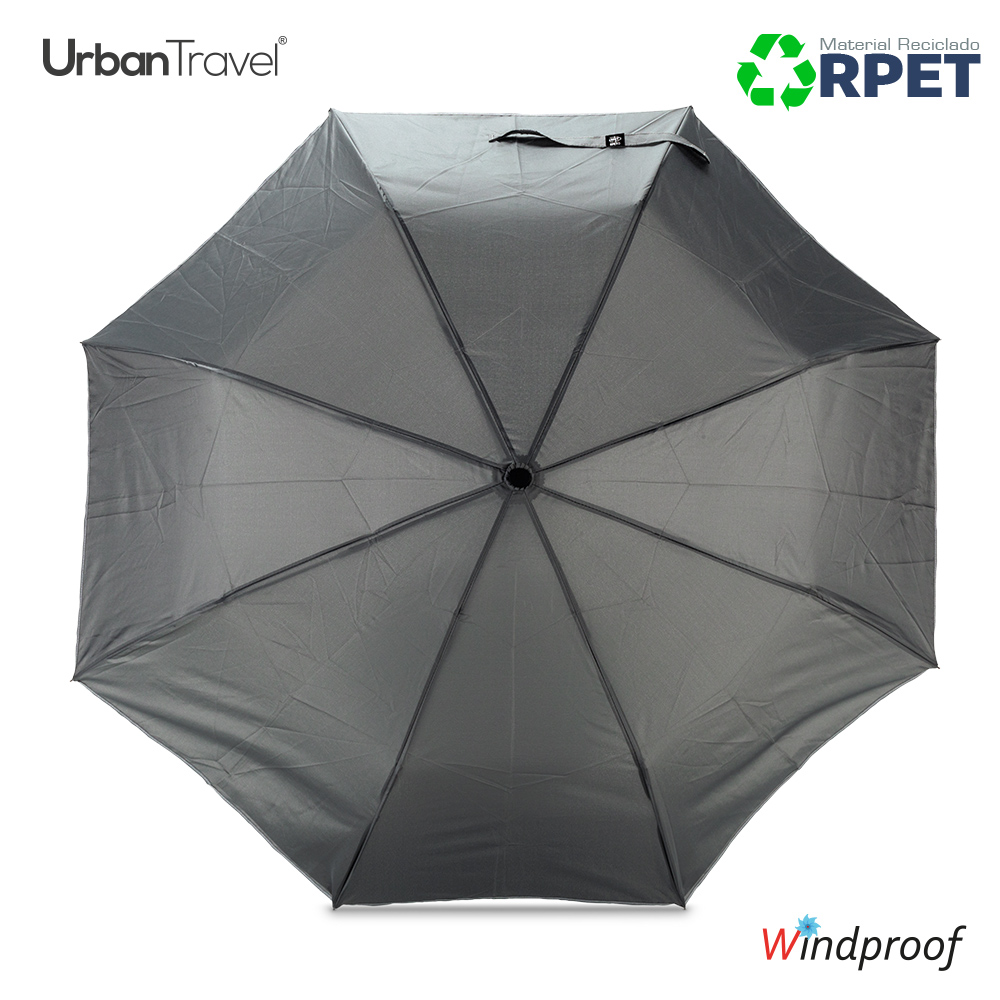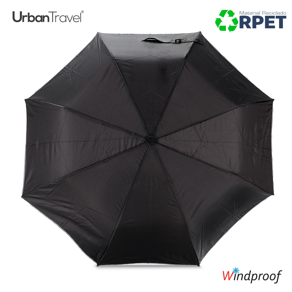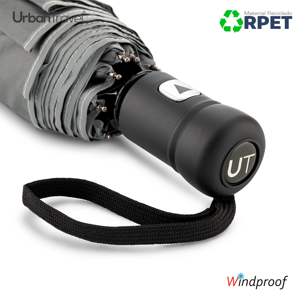 Paraguas plegable en poliéster reciclado RPET y borde reflectivo. Apertura automática. Herraje en fibra de vidrio y acero. Sistema antibrisa, mango en caucho. Con forro para cargar. 8 cascos.