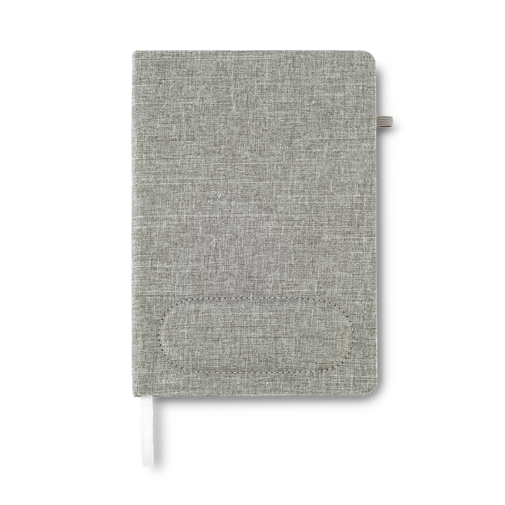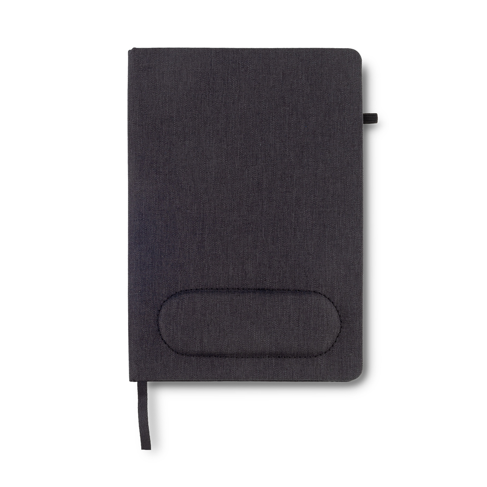 Cubierta en poliéster, con mouse pad. Apoya muñecas ergonómico acolchado. 80 hojas de papel crema con rayas.