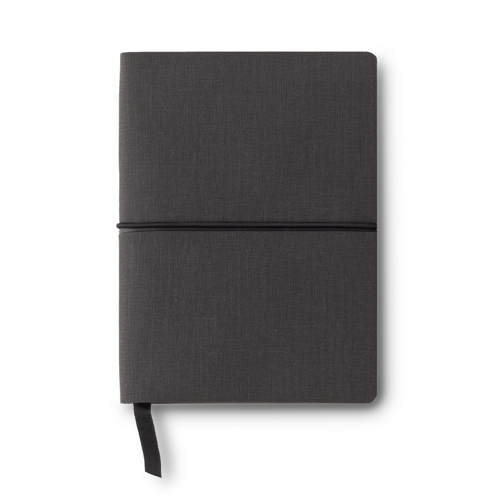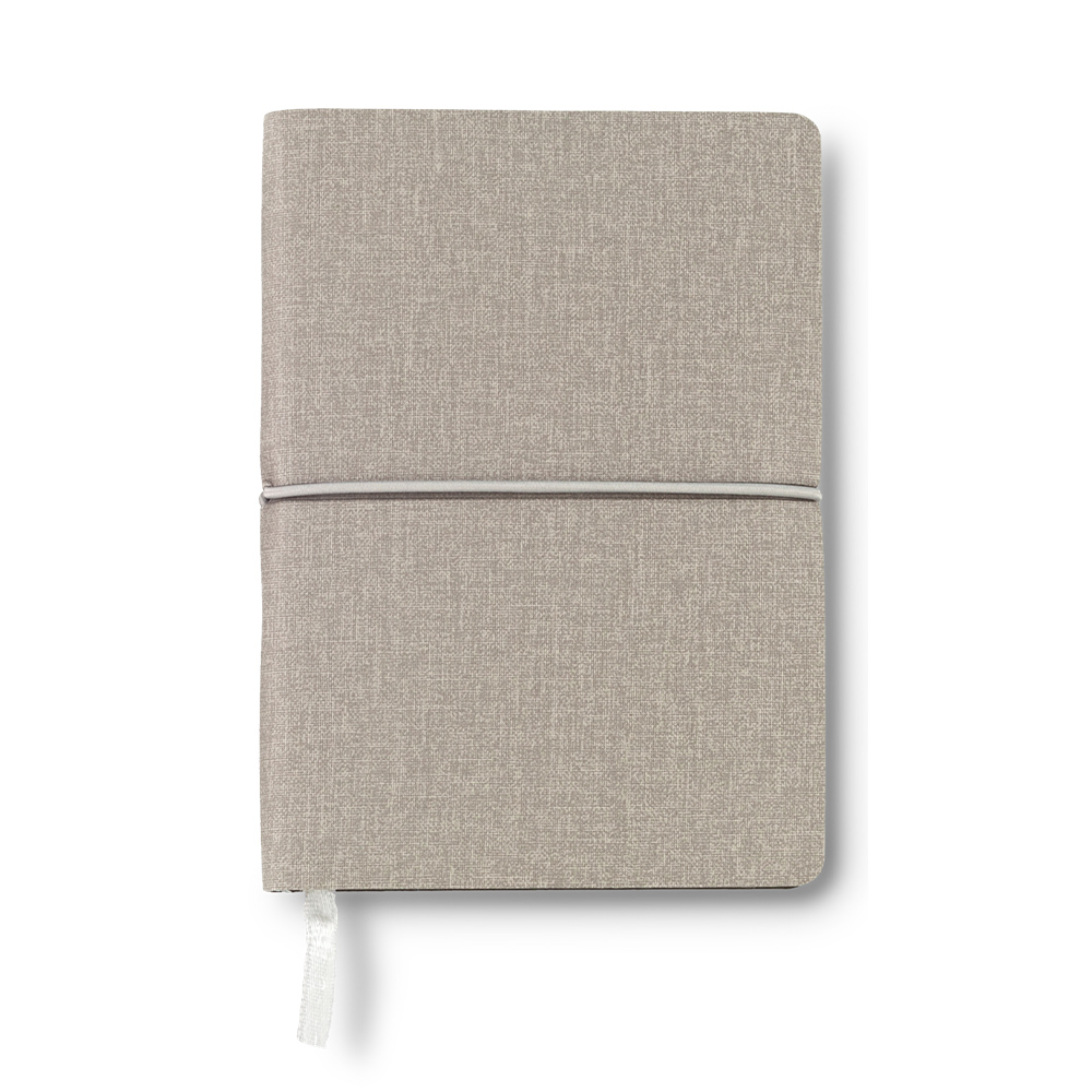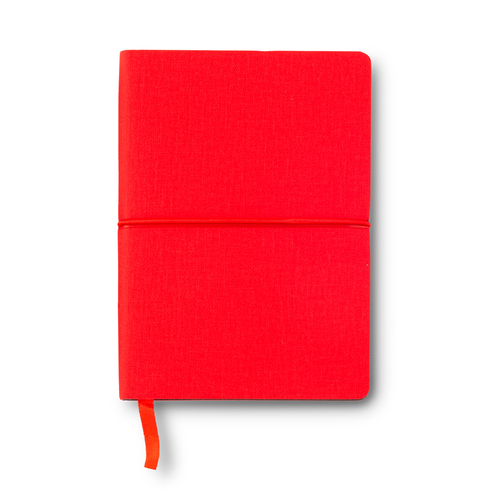 Libreta con cubiertas en poliuretano, 80 hojas de papel color crema con rayas. Con 5 stickies de colores surtidos y un taco de papel adhesivo amarillo. Cierre elástico.
