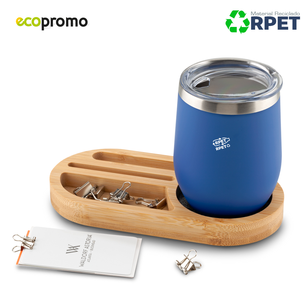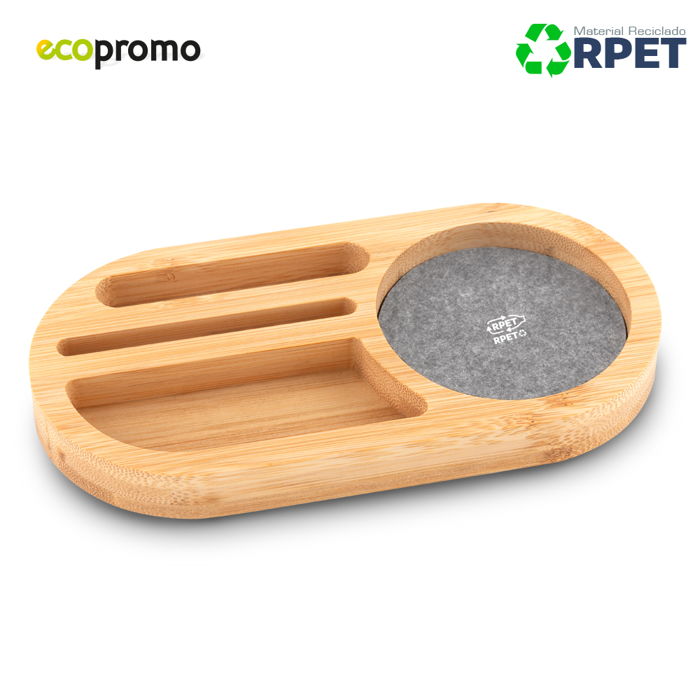Soporte para móviles con portavasos y organizador. En bambú y poliéster reciclado RPET.