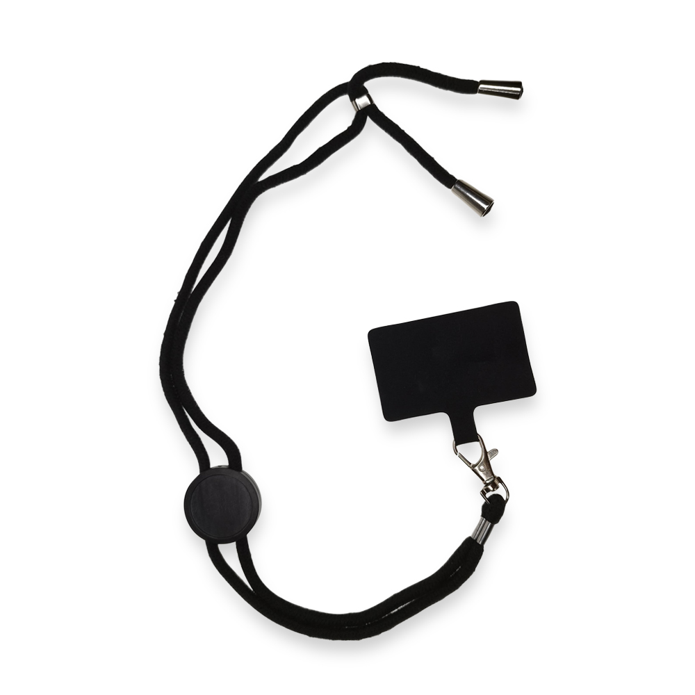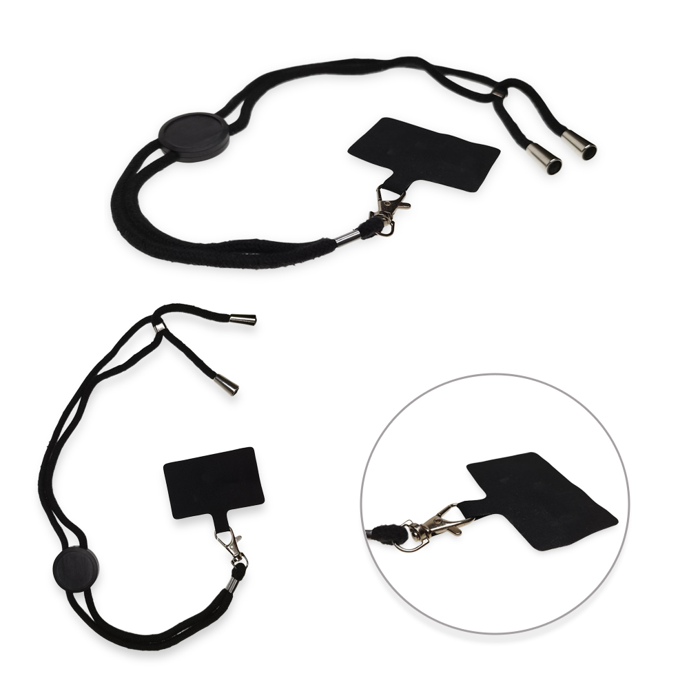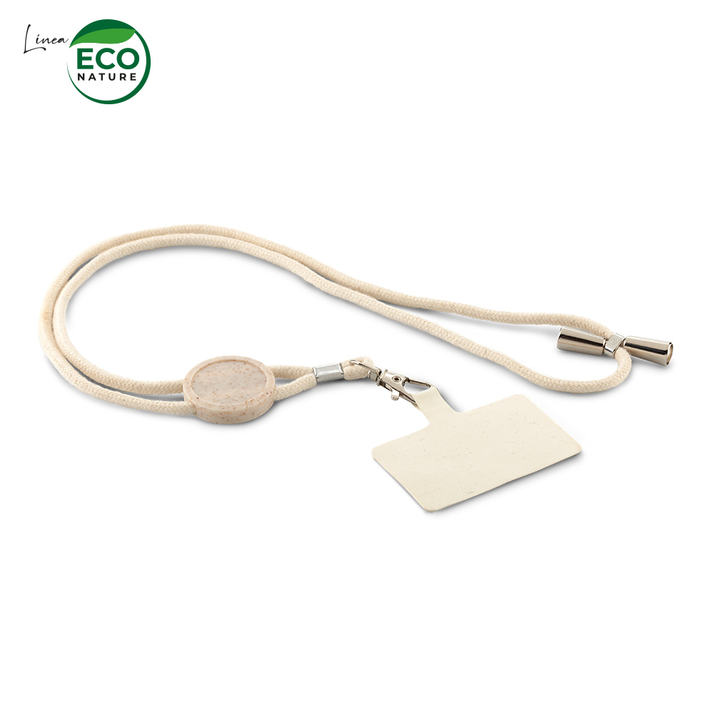 Cinta portacarnet en algodón con gancho metálico y partes en plástico ecológico de fibra de trigo.Con tarjeta para insertar en forro del móvil.