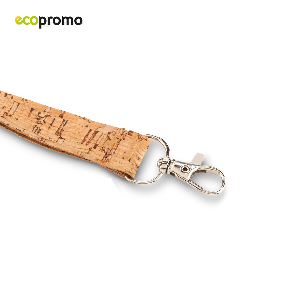 Cinta para portacarnet en corcho con broche de seguridad y gancho metálico.