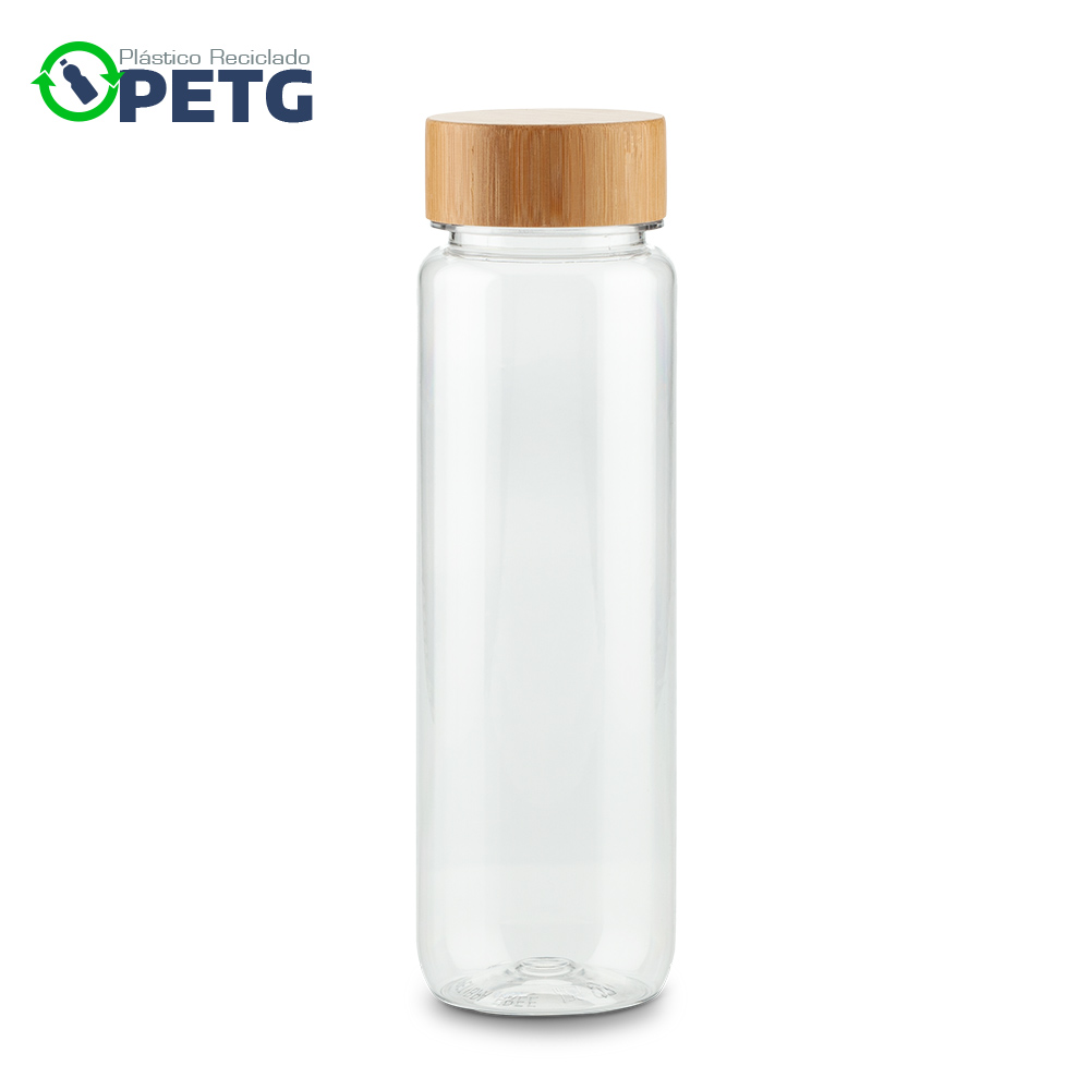 Botilito elaborado en plástico reciclado PETG. Material de alta transparencia, mayor firmeza y durabilidad, libre de BPA, resistente al desgaste e impactos menores y reciclable. Tapa rosca en bambú.