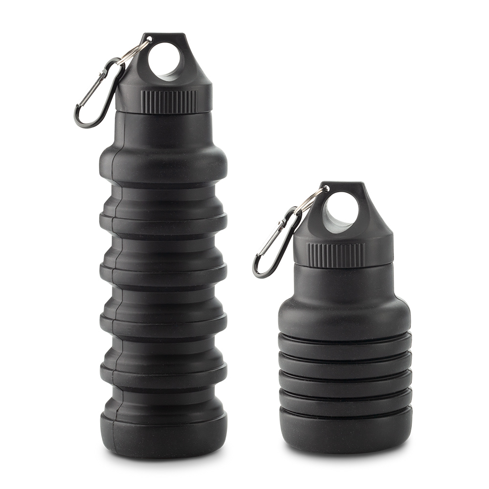 Botilito en silicona colapsible, con tapa plástica de rosca, gancho carabinero y placa para marca de logo. Empaque caja individual.