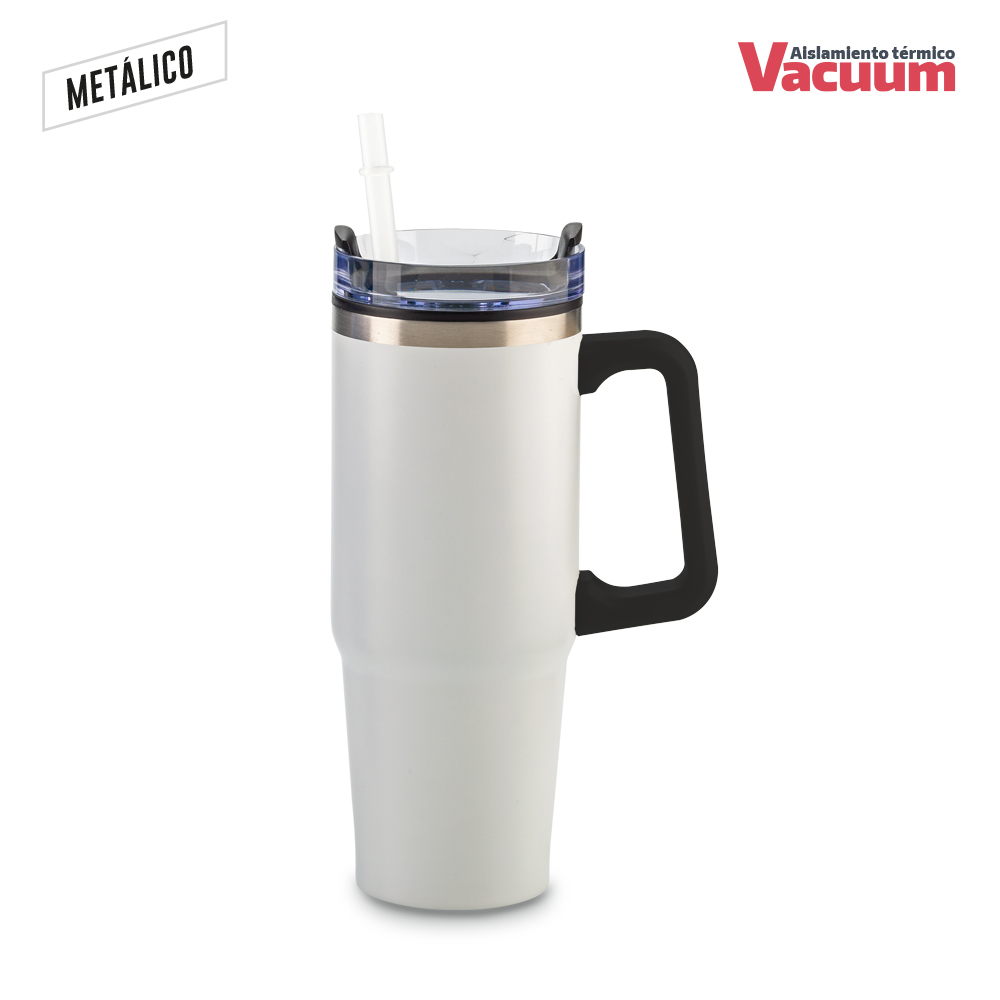 Mug metálico vacuum en acero inoxidable, con aislamiento térmico que mantiene la bebida fría o caliente hasta 6h, aprox (puede variar dependiendo condiciones climáticas). Con tapa rosca y manija en plástico. Incluye pitillo plástico. Empaque caja individual.