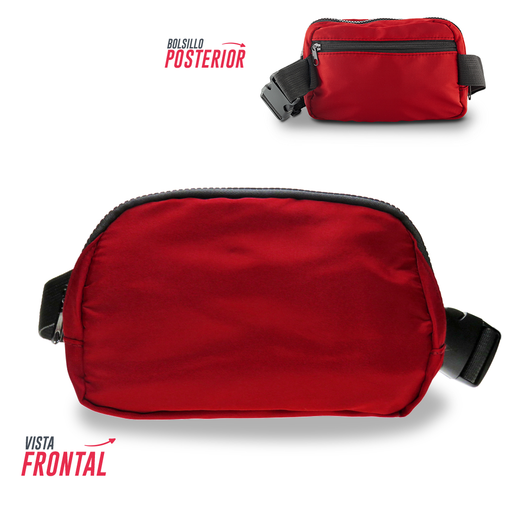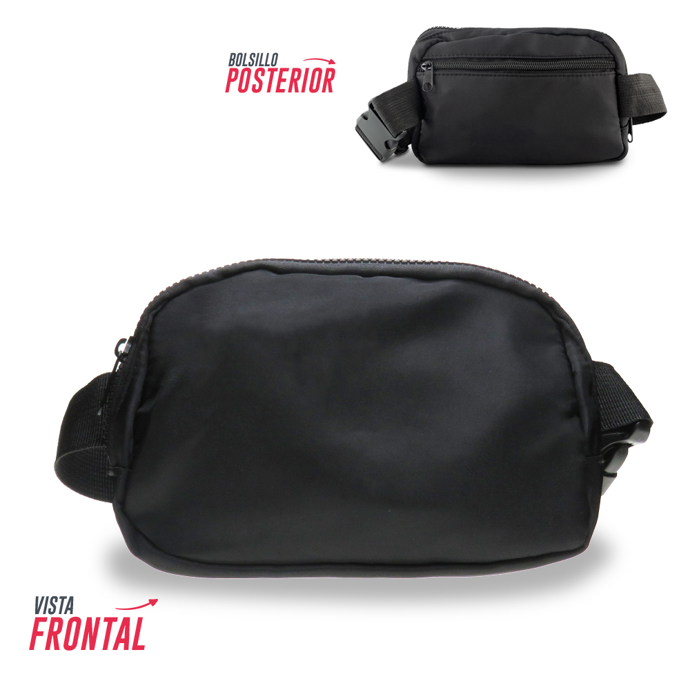 Canguro en poliéster. Con bolsillo posterior con cremallera.