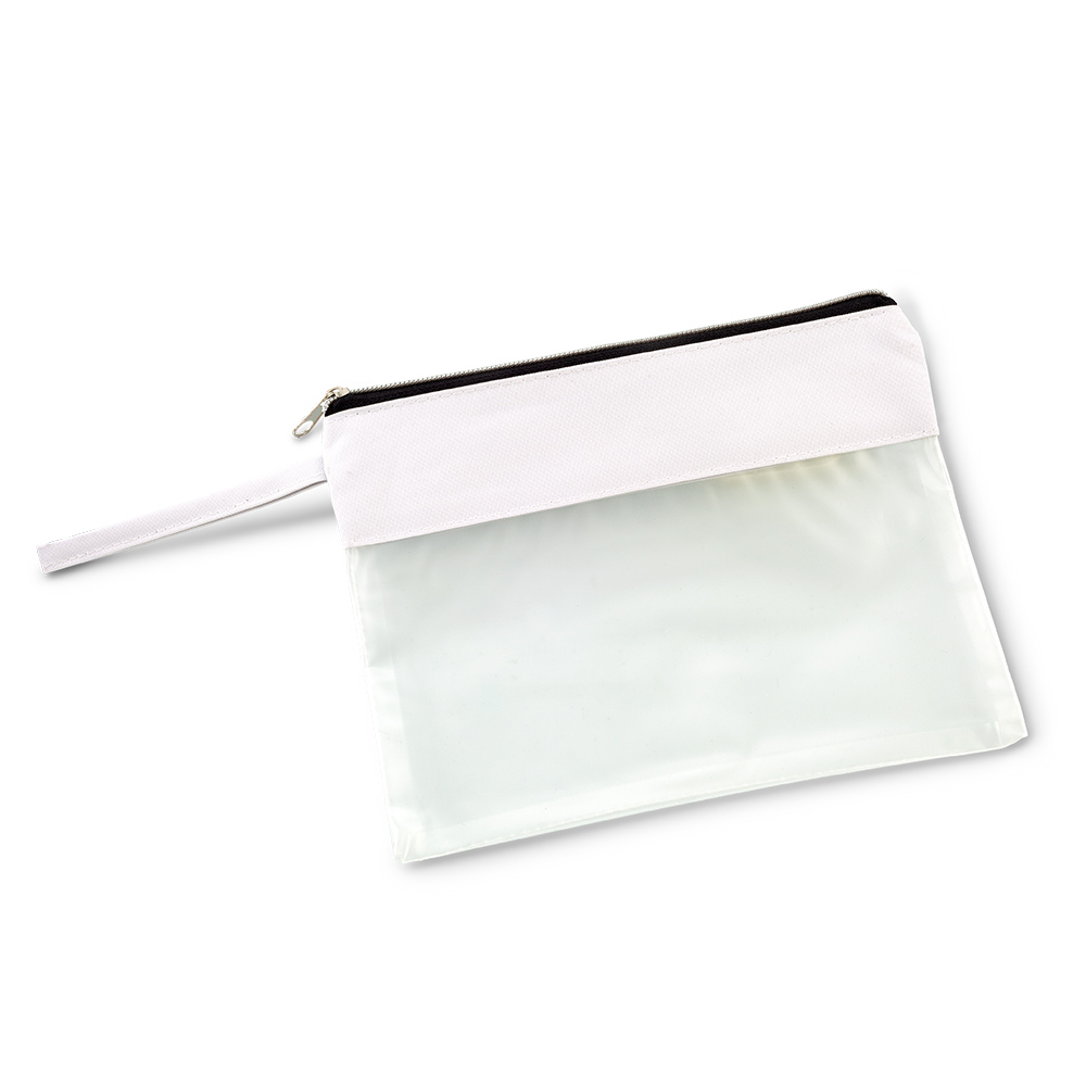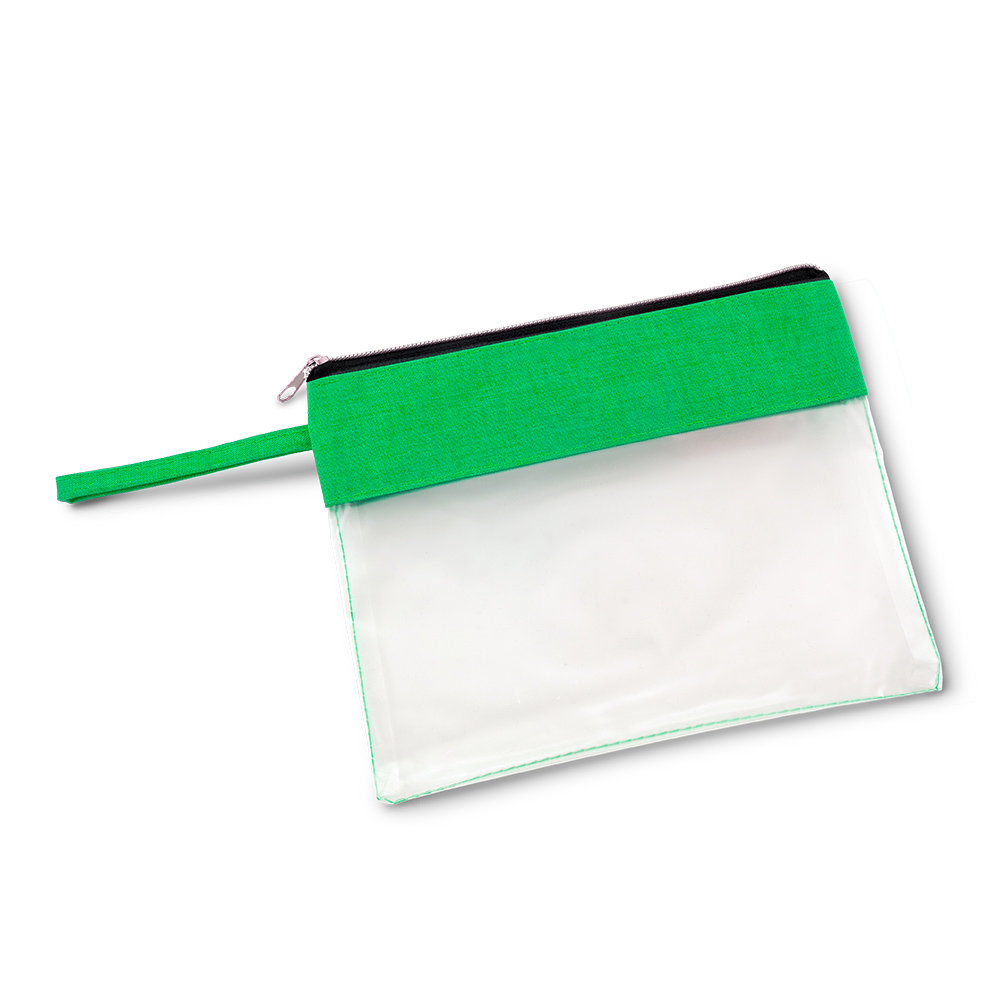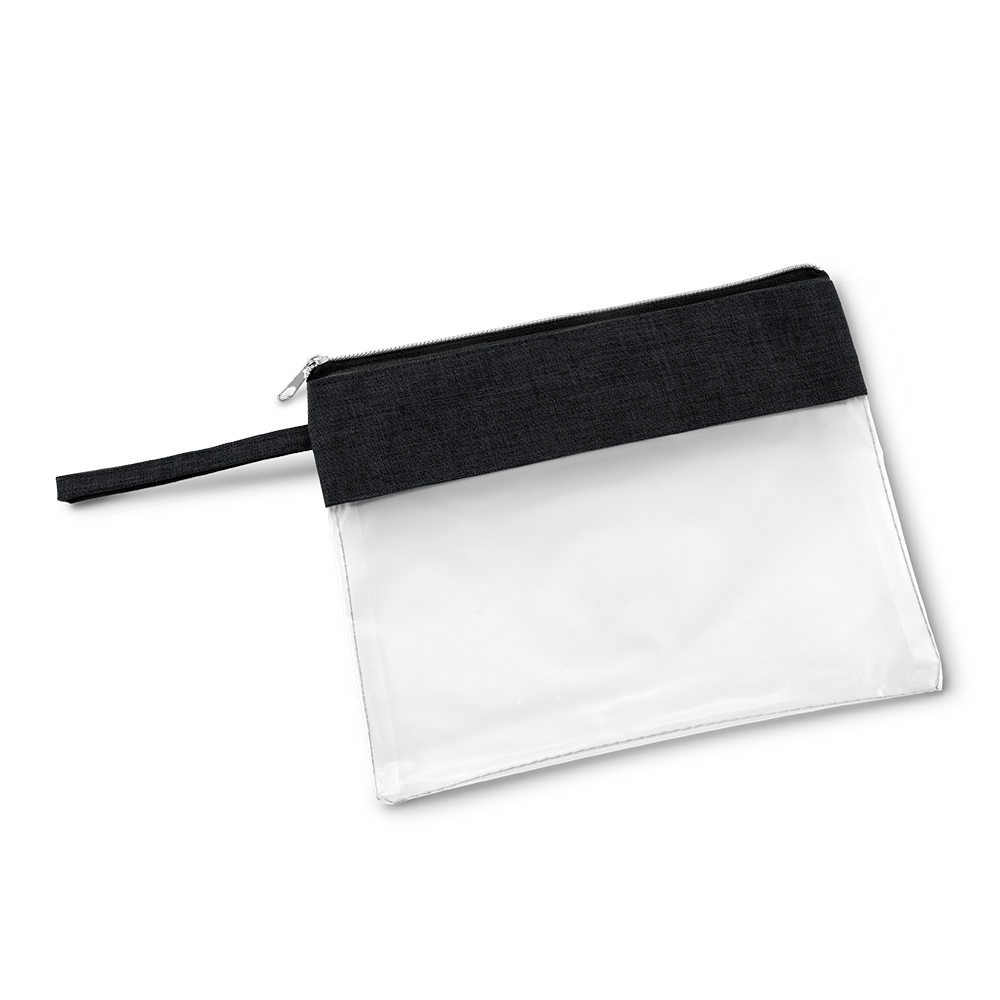 Estuche en PVC y poliéster, con cierre de cremallera.