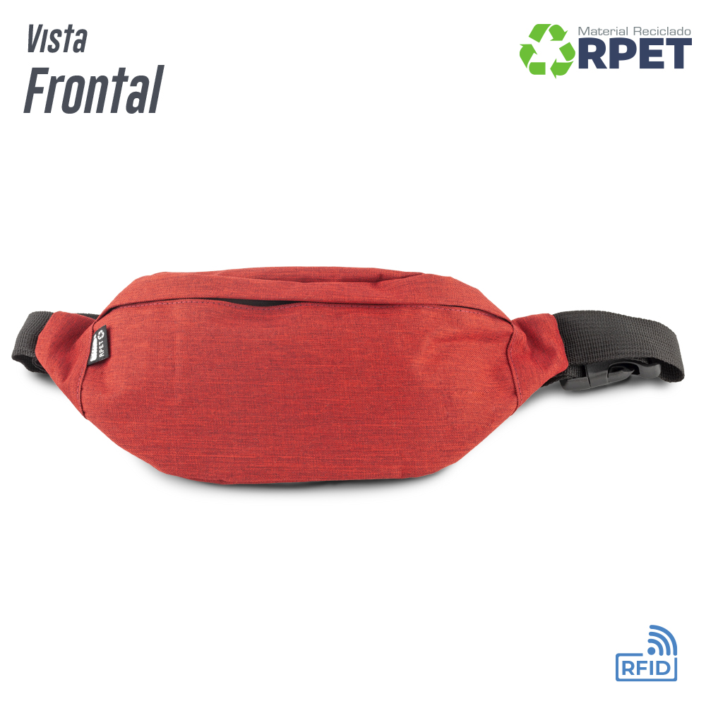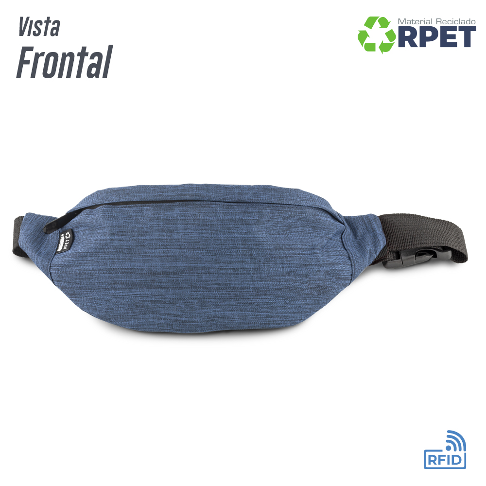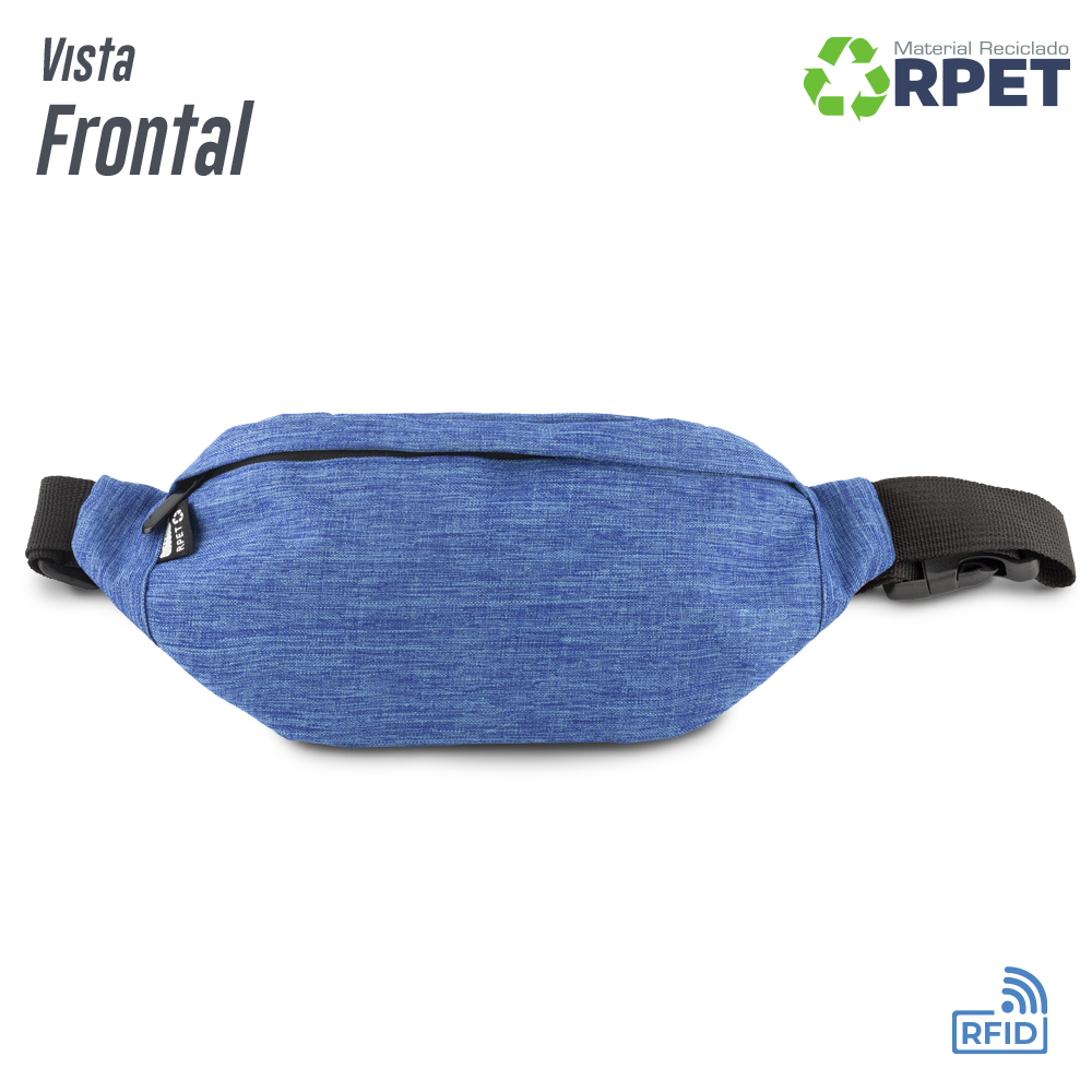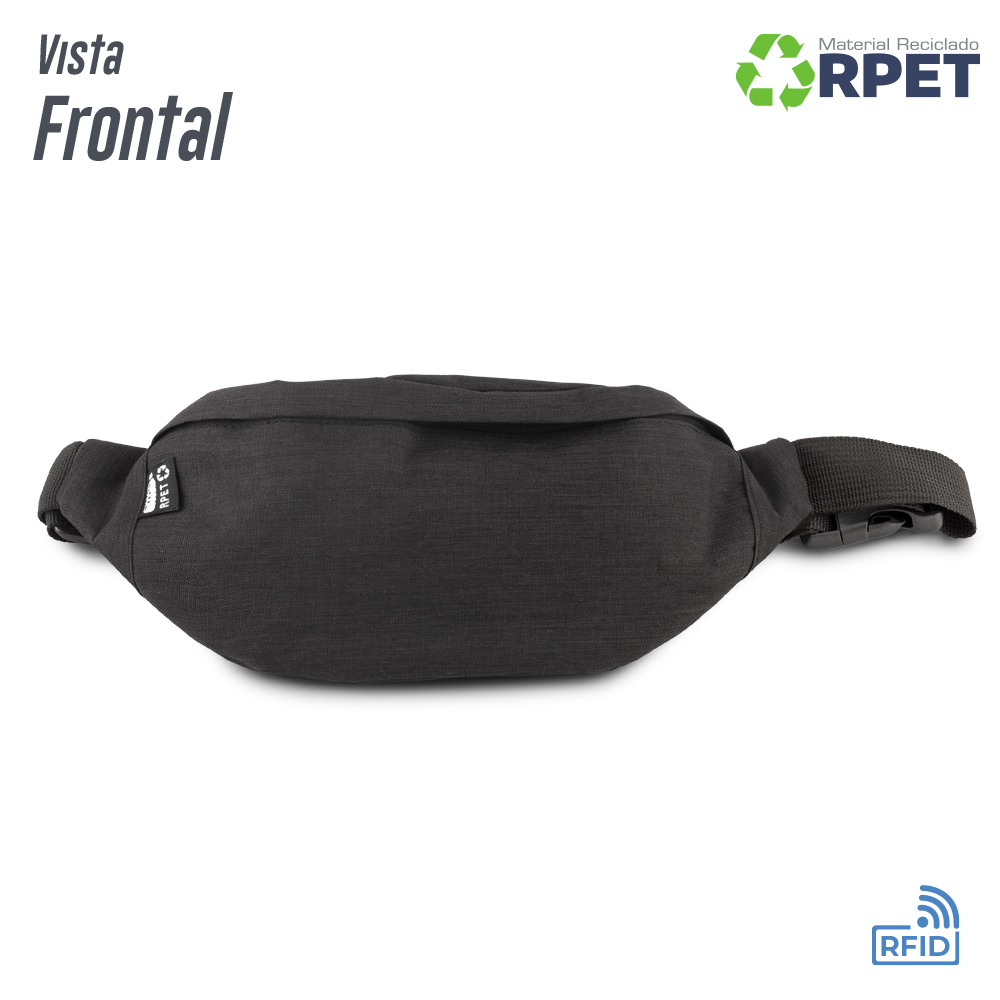 Canguro en poliéster reciclado RPET . Bolsillo posterior con cremallera. Con protección RFID. Su material interno permite bloquear las señales electromagnéticas RFID (Radio Frequency Identification) que se usan en tarjetas de chip, pasaportes, tarjetas electrónicas de transporte, etc.