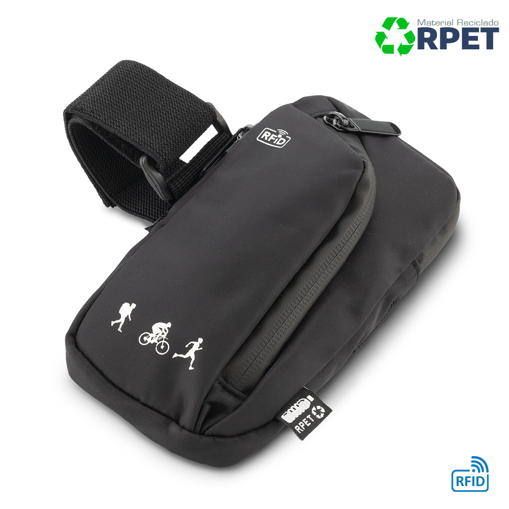 Funda portacelular para uso en el brazo, fabricada en poliéster reciclado RPET. Su material interno permite bloquear las señales electromagnéticas RFID (Radio Frequency Identification) que se usan en tarjetas de chip, pasaportes, tarjetas electrónicas de transporte, etc. Bolsillo exrterior con cremallera.