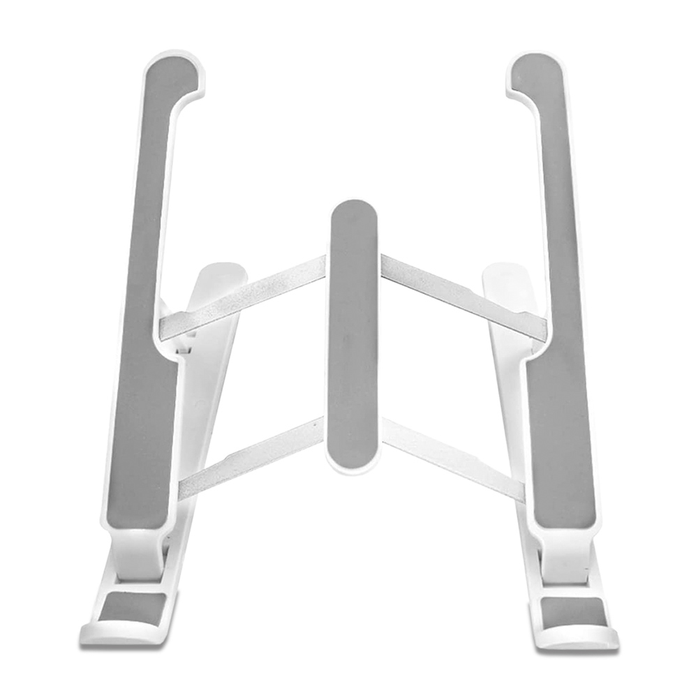 Soporte Portátil Plegable plástico. Ligero, con ajuste de altura en la parte posterior y puntas antideslizantes. La posición del dispositivo sobre el soporte ayuda a que no se recaliente, mejora la posición de la columna vertebral y reduce la fatiga de cuello, espalda y ocular. Se sugiere usar en dispositivos entre 10 y 15 pulgadas. Con funda para cargar y caja individual.