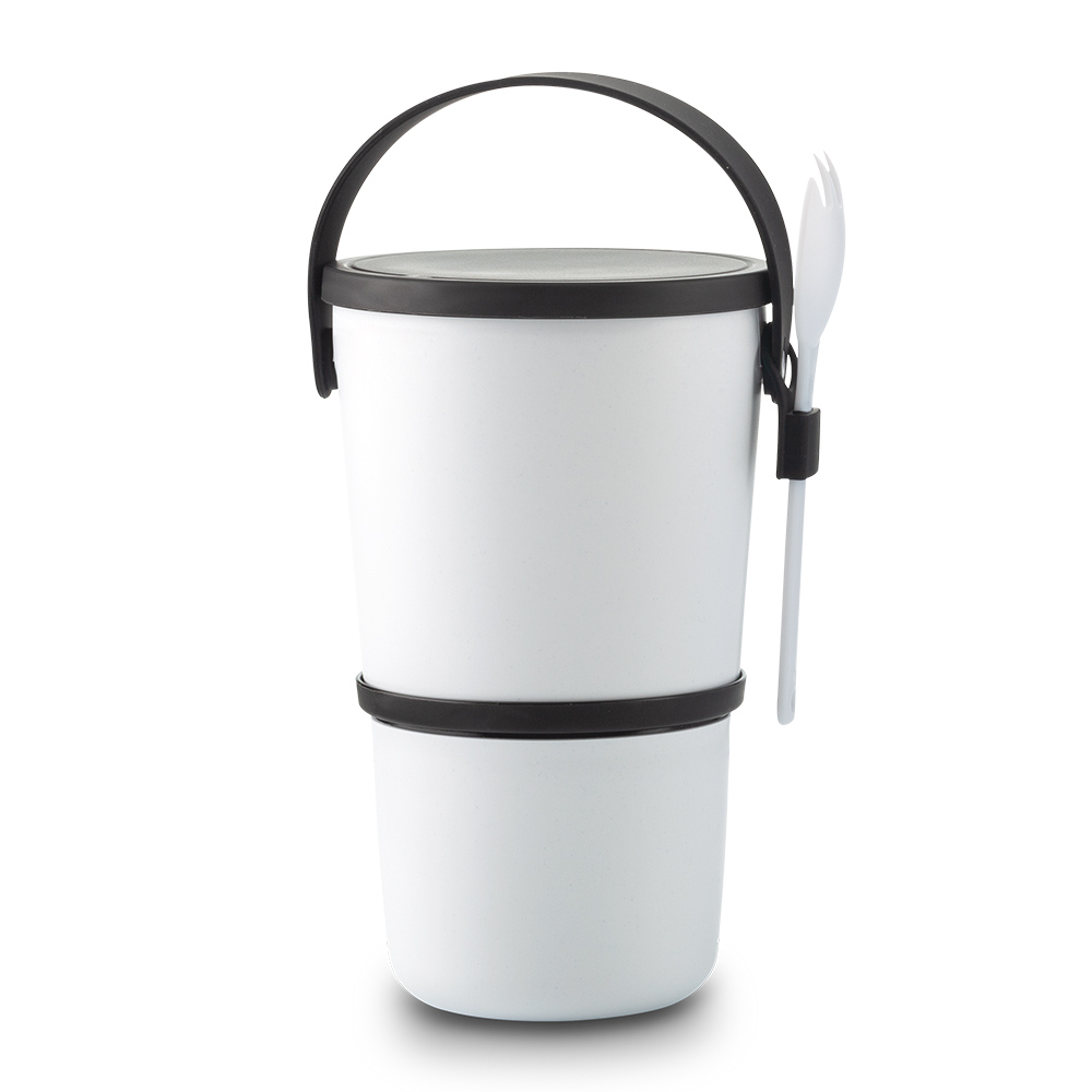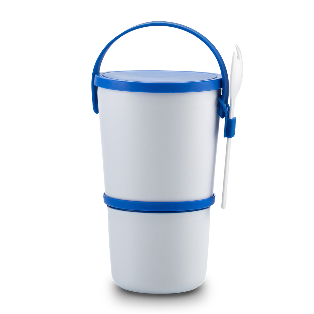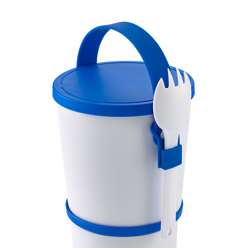 Portacomidas plástico con dos compartimentos. Incluye tenedor, banda en silicona para cargar.