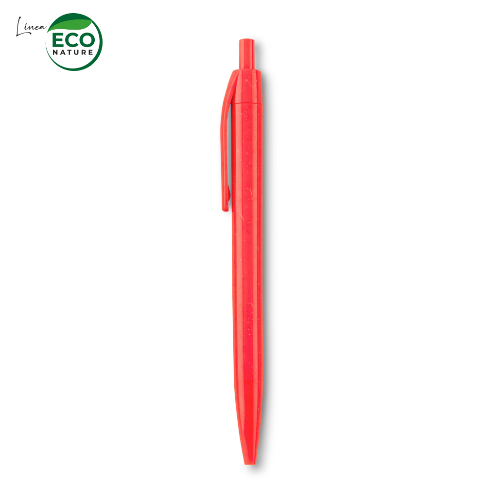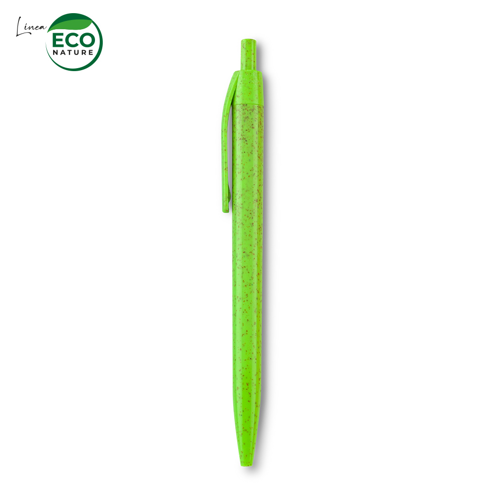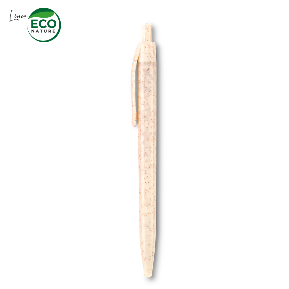 Bolígrafo plástico elaborado con fibra de trigo (50% aprox). El porcentaje de material ecológico tiene un promedio de biodegradabilidad de 2-3 años después del fin de su vida útil. Mecanismo push.
