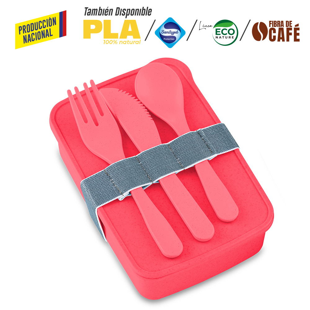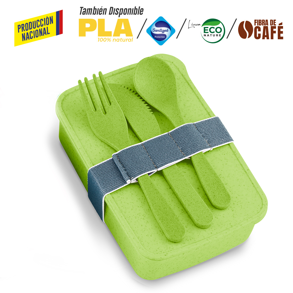 Portacomidas de producción nacional en plástico mezclado con material ecológico en fibra de trigo (50%-60% aprox). Incluye tres cubiertos, banda para cerrar y llevar los cubiertos. El porcentaje de material ecológico tiene un promedio de biodegradabilidad de 2-3 años después del fin de su vida útil.