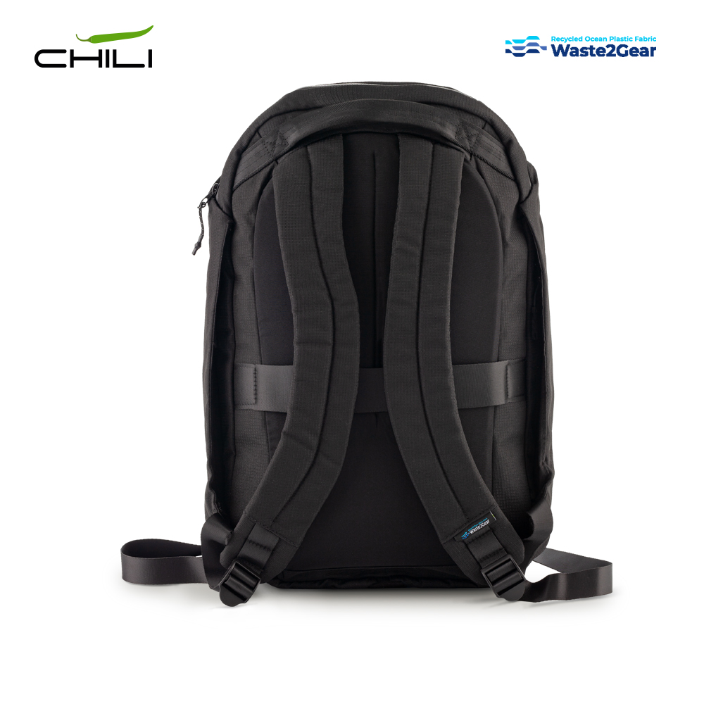 Morral en poliéster reciclado de residuos plásticos recuperados del océano. Seis compartimentos con cierre de cremallera. Incluye placa metálica para marcar.
