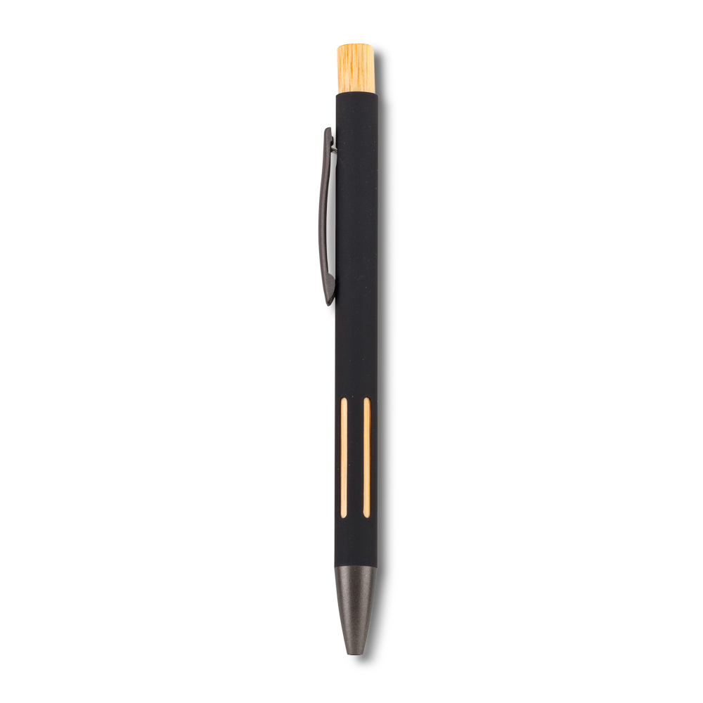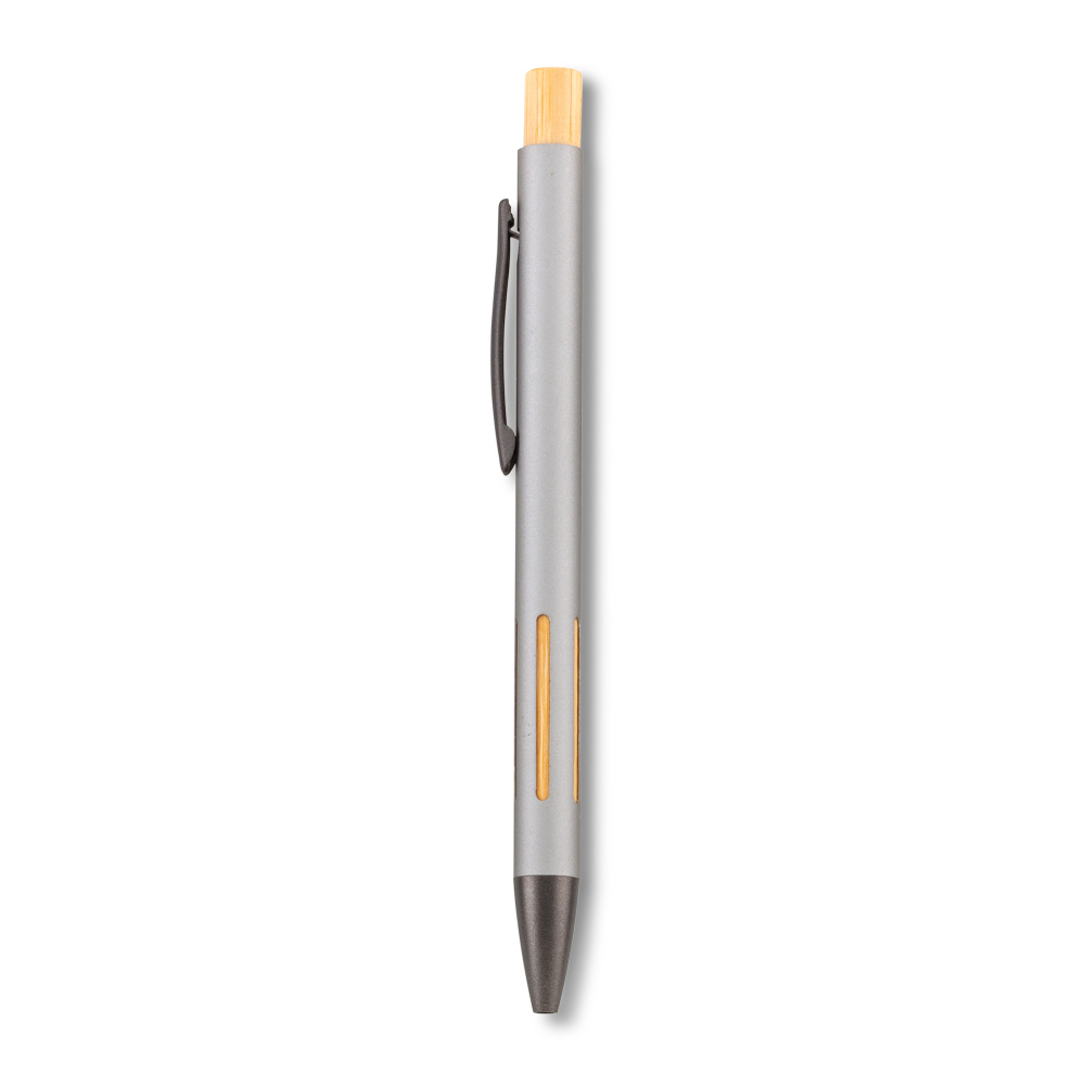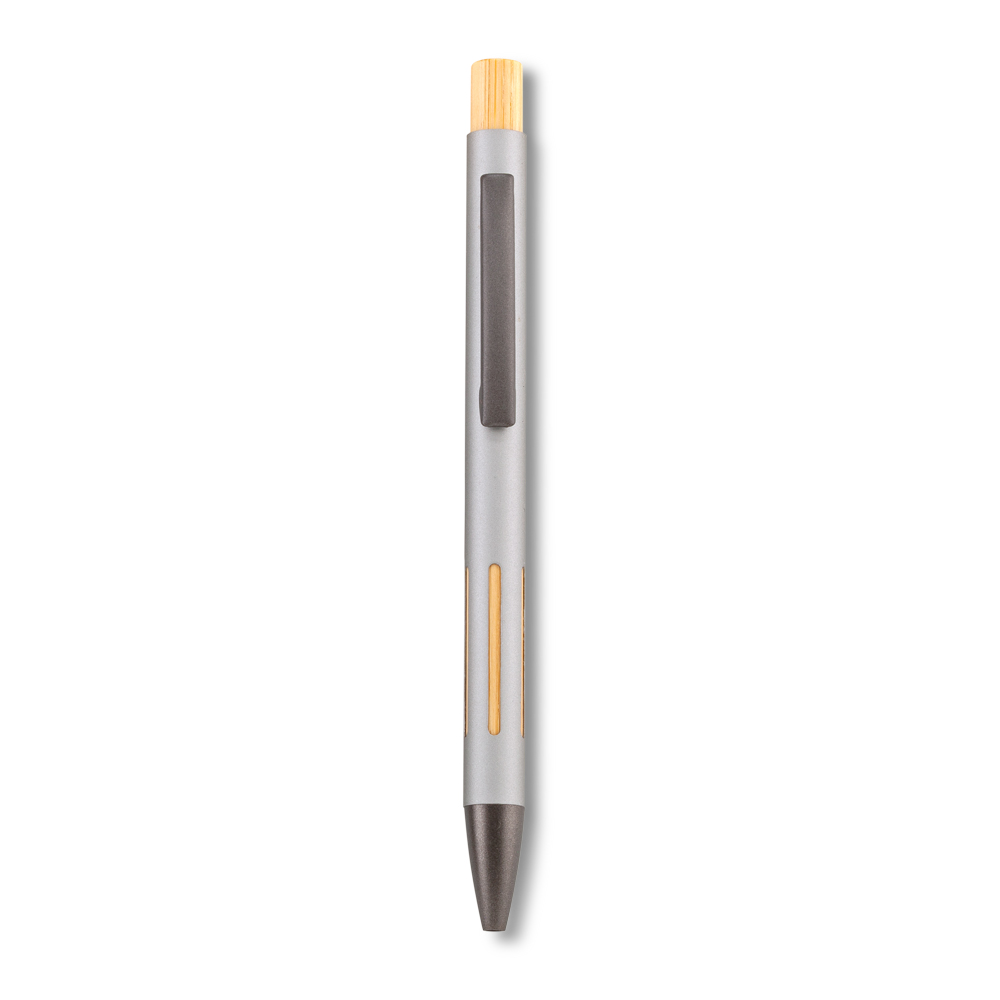 Bolígrafo metálico con partes en bambú. Mecanismo push en bambú.Clip metálico.