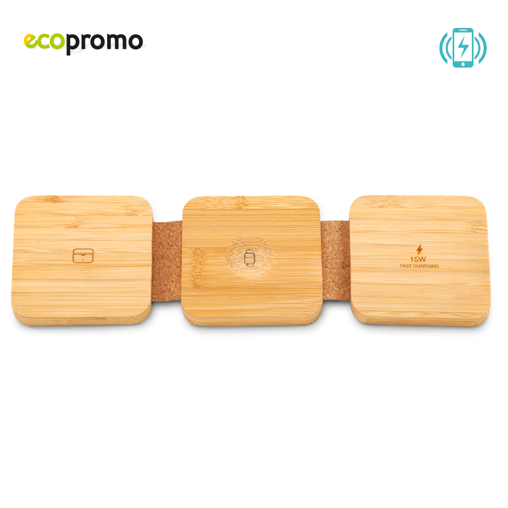 Cargador inalámbrico 3-1 plegable en bambú y corcho de 15W. Cargador para Celular, Apple Watch y Audífonos. Incluye cable Tipo C para carga. Empaque caja individual.