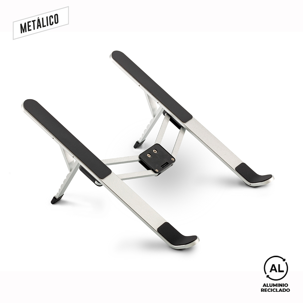 Soporte Portátil Plegable en aluminio reciclado. Ligero, con ajuste de altura en la parte posterior y puntas antideslizantes. La posición del dispositivo sobre el soporte ayuda a que no se recaliente, mejora la posición de la columna vertebral y reduce la fatiga de cuello, espalda y ocular. Se sugiere usar en dispositivos entre 10 y 15 pulgadas.