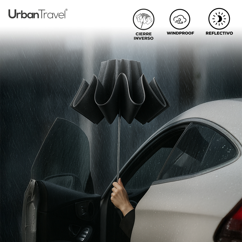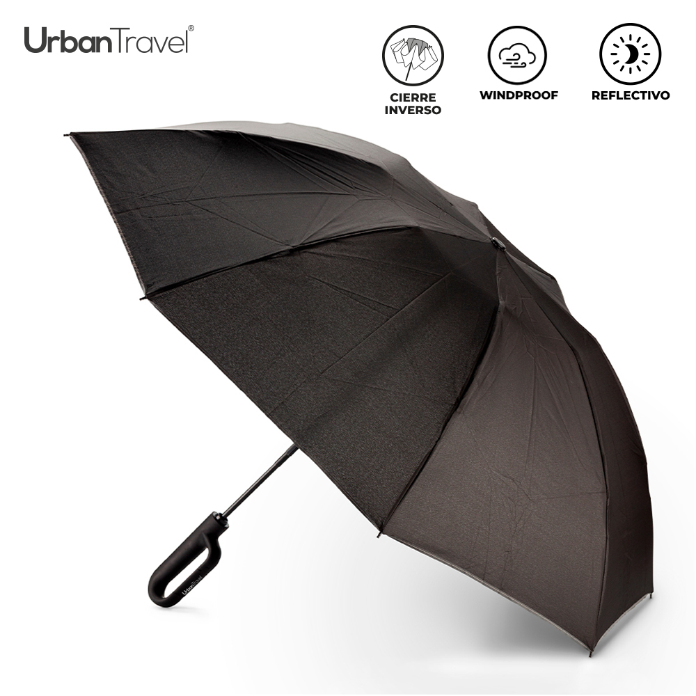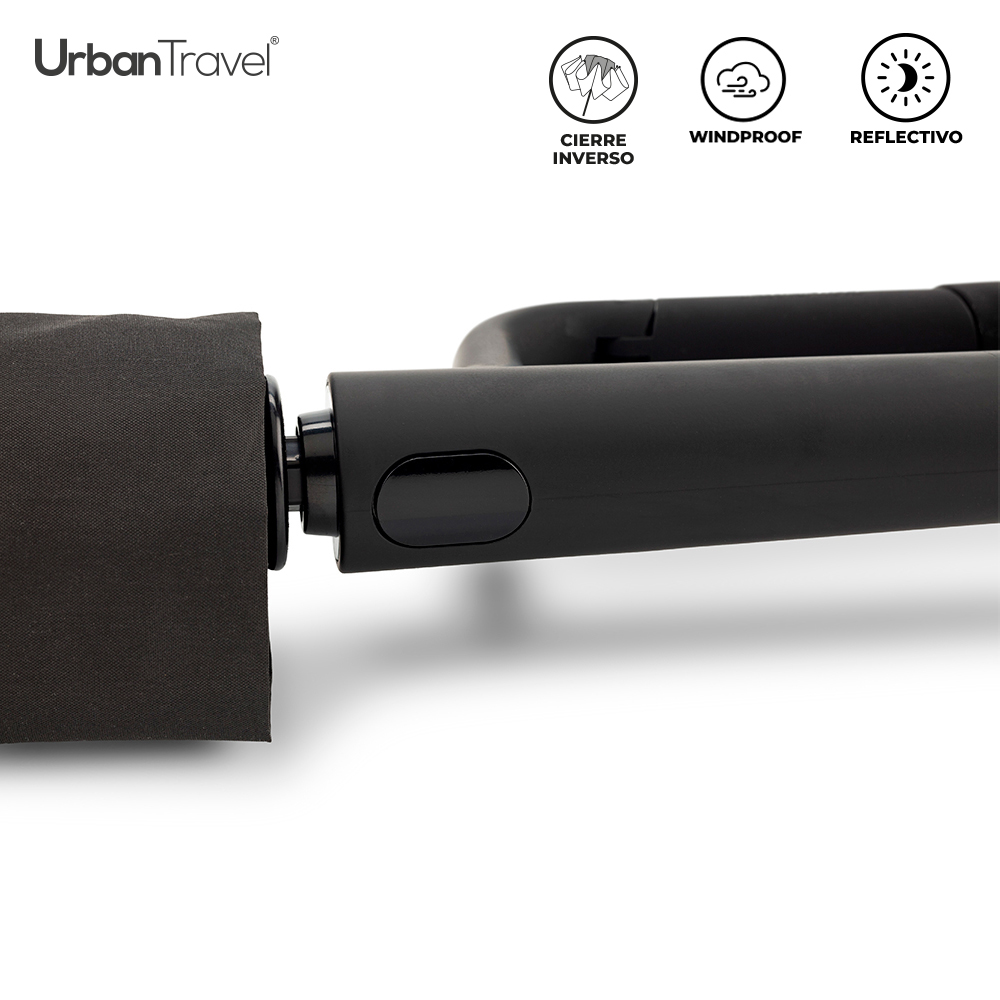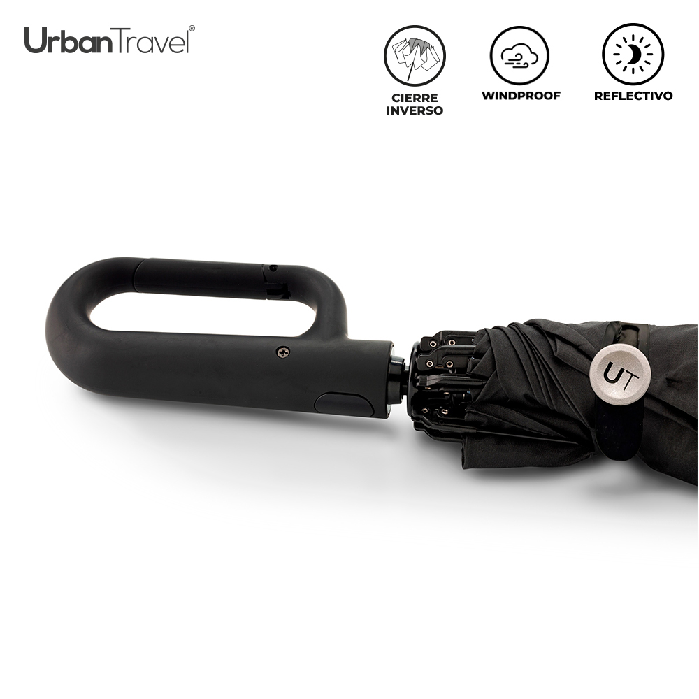 Paraguas plegable en poliéster pongee 190T con herraje en aluminio y bordes reflectivos. Apertura y cierre automático, 8 cascos. Mango tipo carabinero en caucho para poderlo colgar. Incluye funda reciclada RPET.