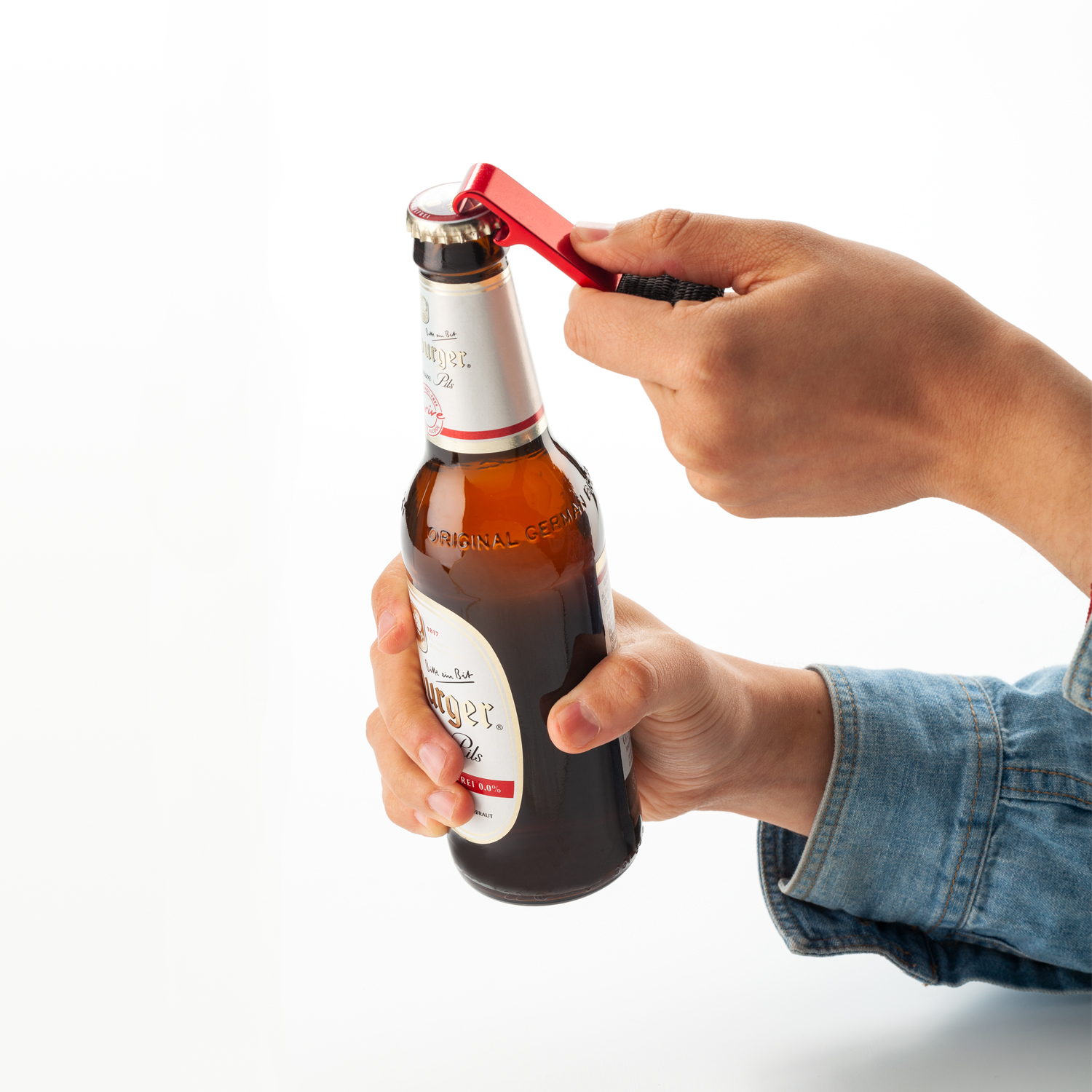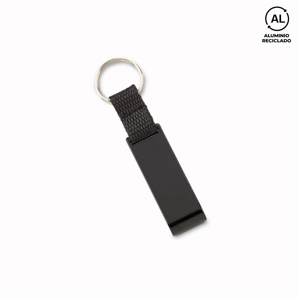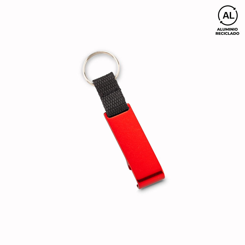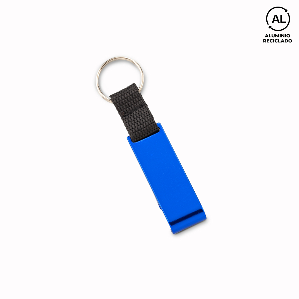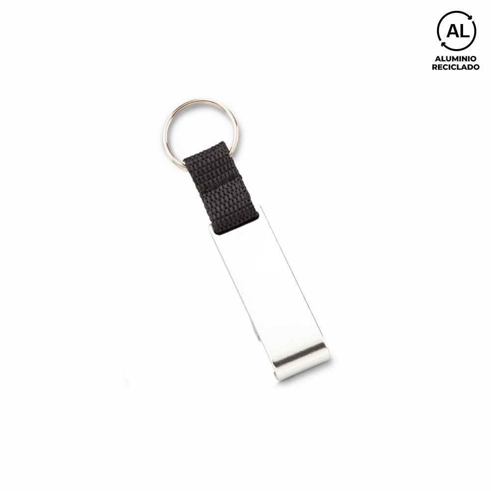 Llavero en aluminio reciclado con destapador y portacelular.