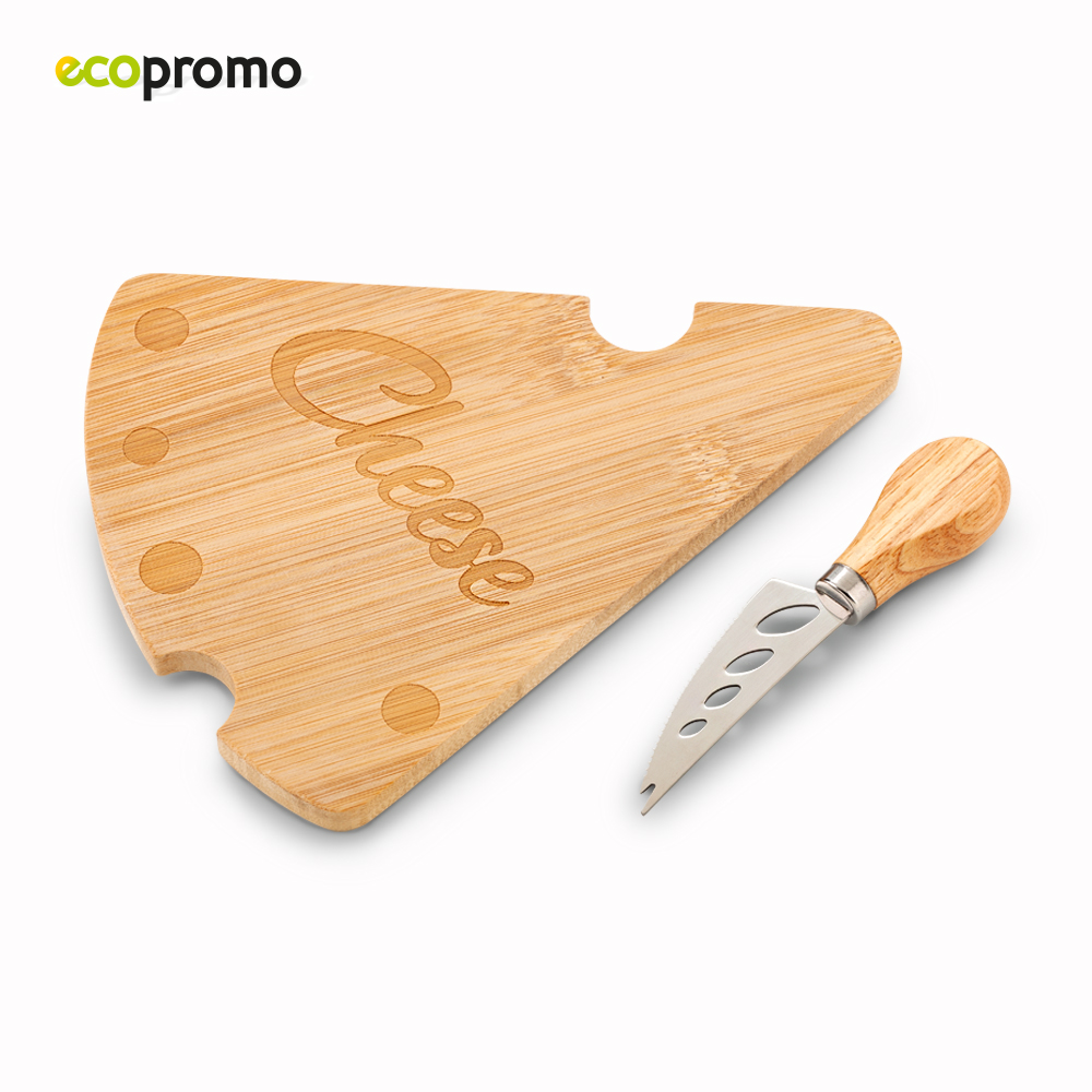 Base triangular en madera y cuchilla especial para quesos en acero inoxidable. Empaque caja individual.