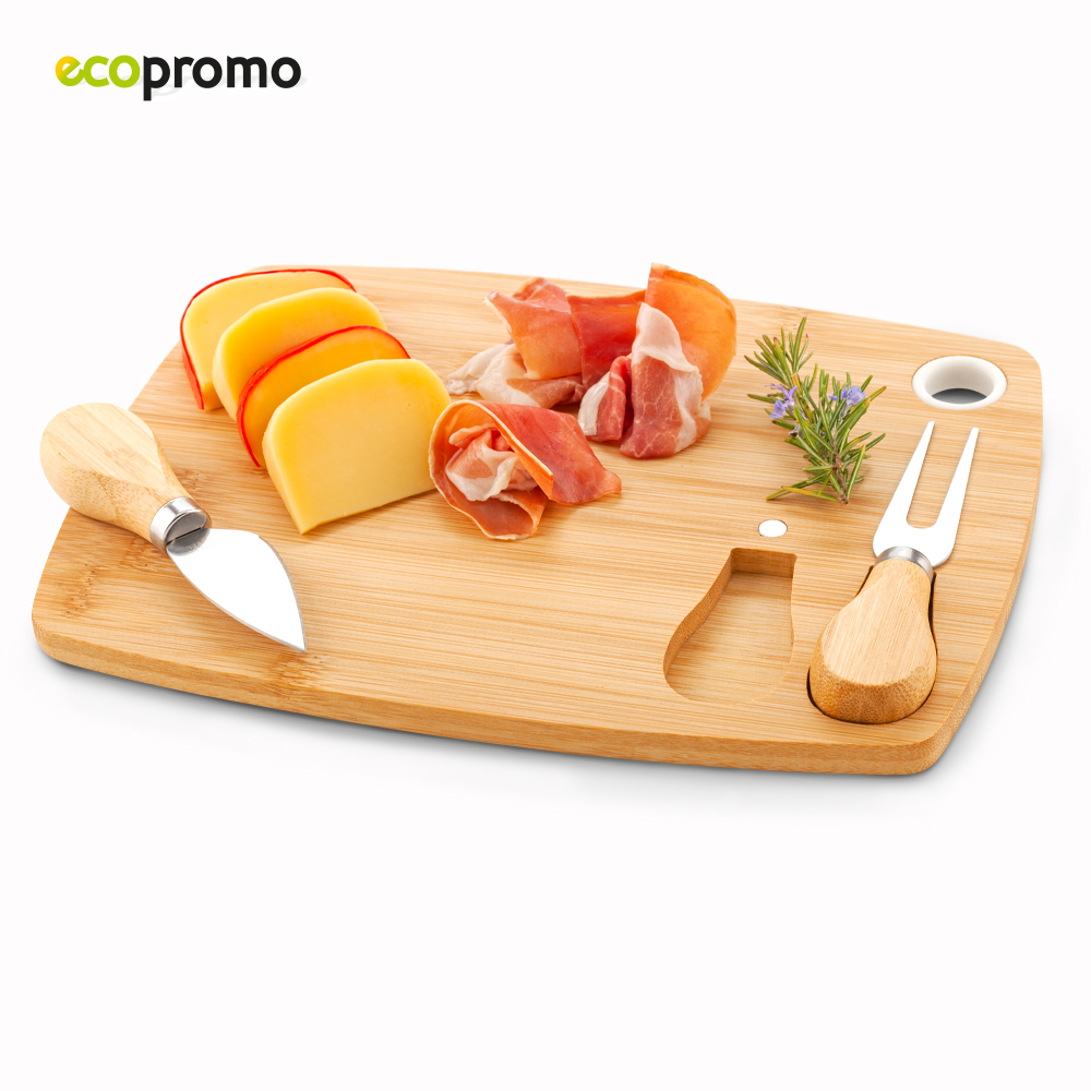 Tabla para cortar en bambú y dos utensilios para queso en acero inoxidable. Empaque caja individual.
