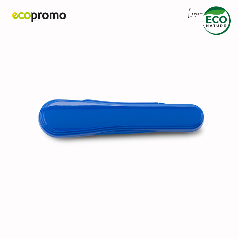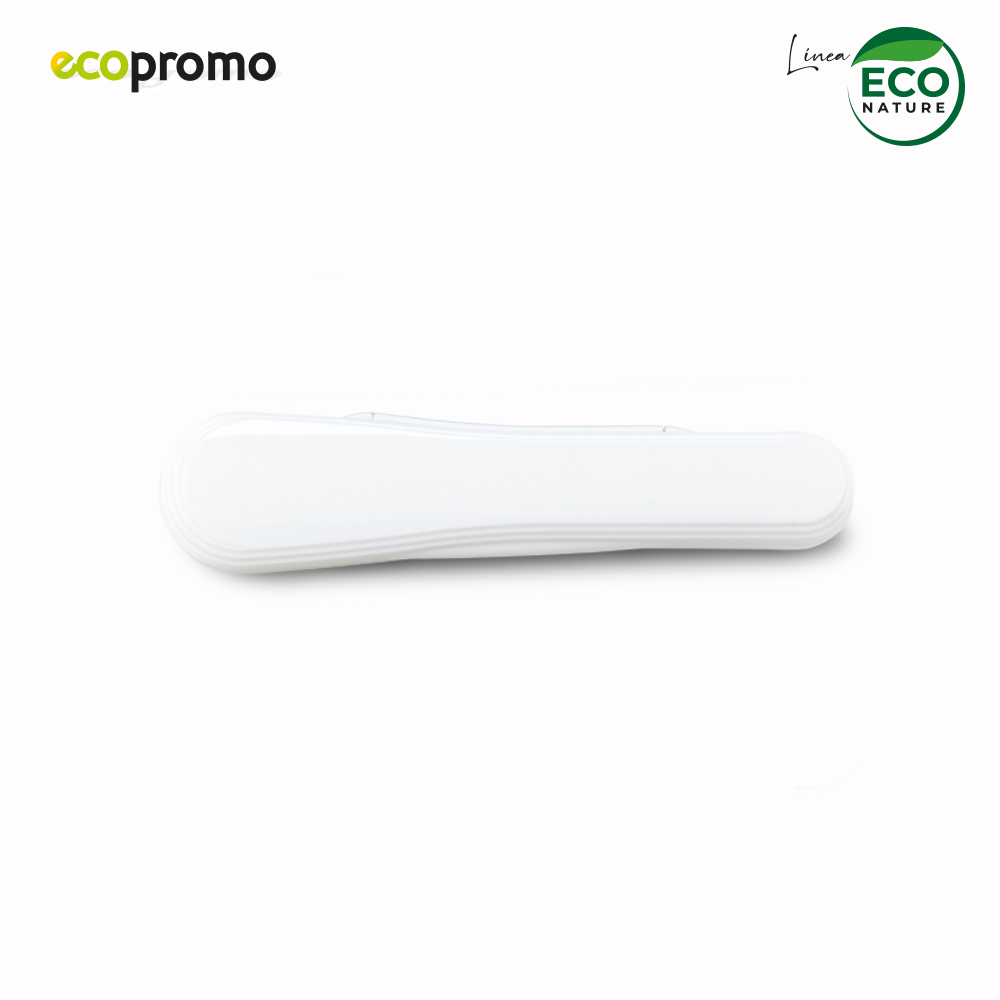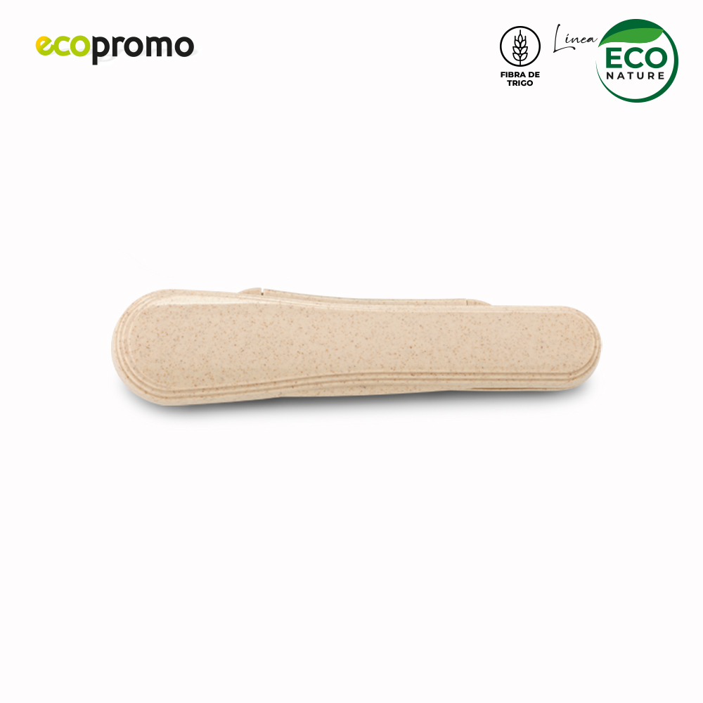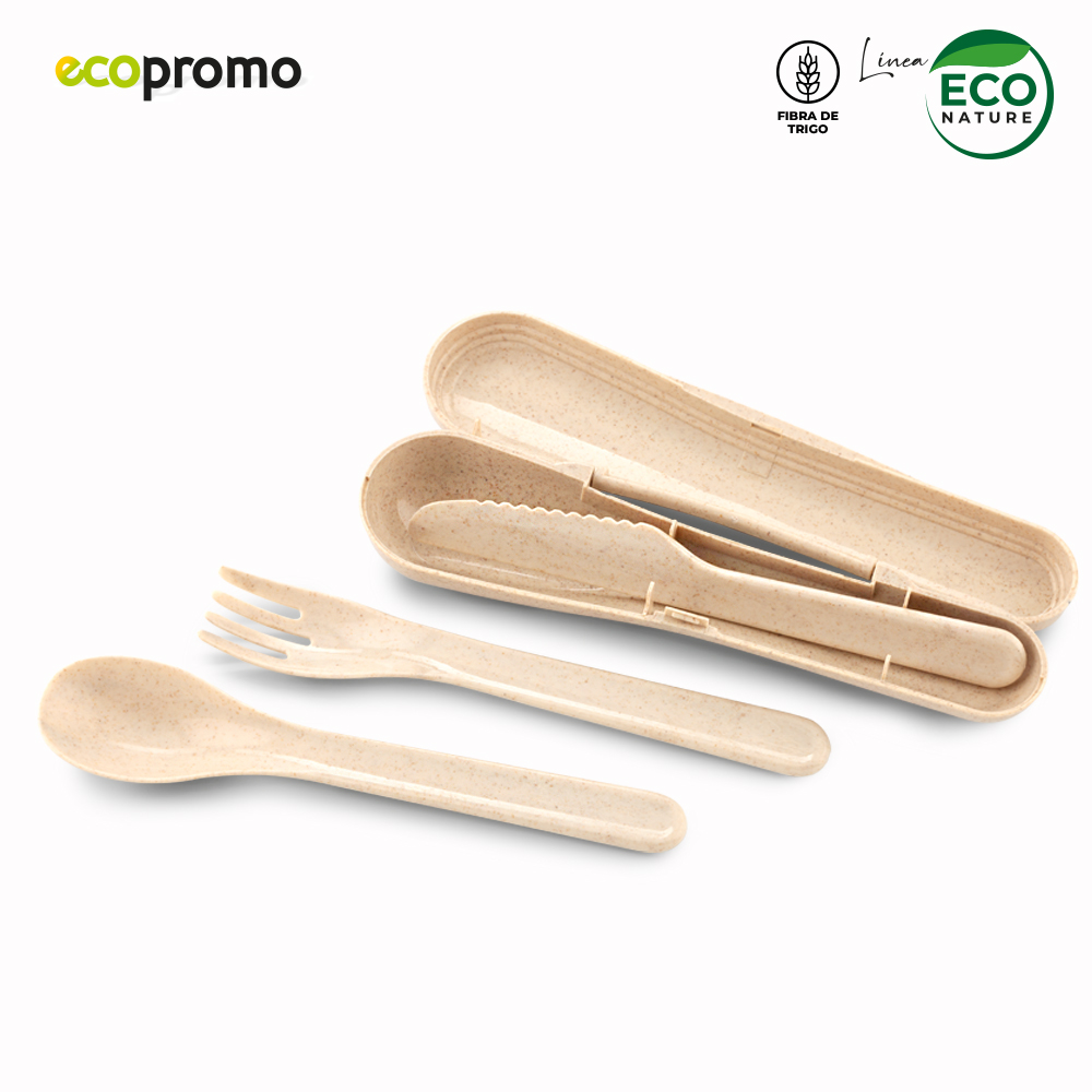 En polipropileno. Incluye cuchara, tenedor, cuchillo y estuche. Color natural en material ecológico en fibra de trigo.