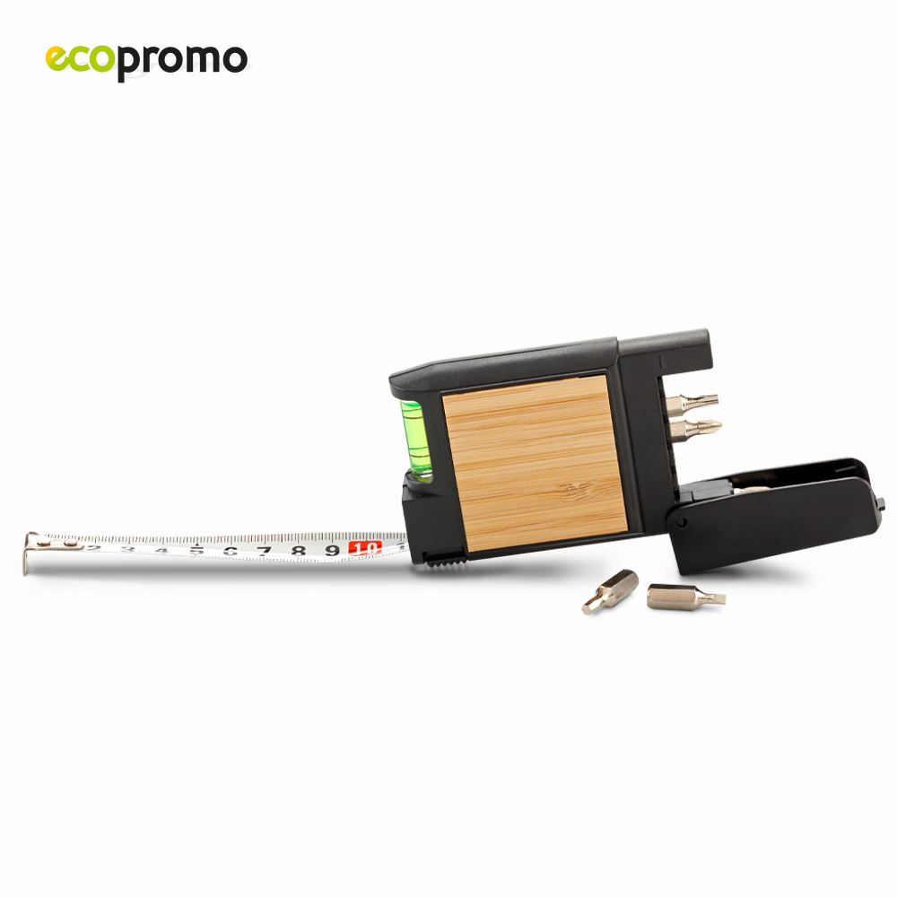 Metro plástico de 3 metros con partes de bambú. Incluye set de destornilladores de 5 piezas y nivelador. Empaque caja individual.