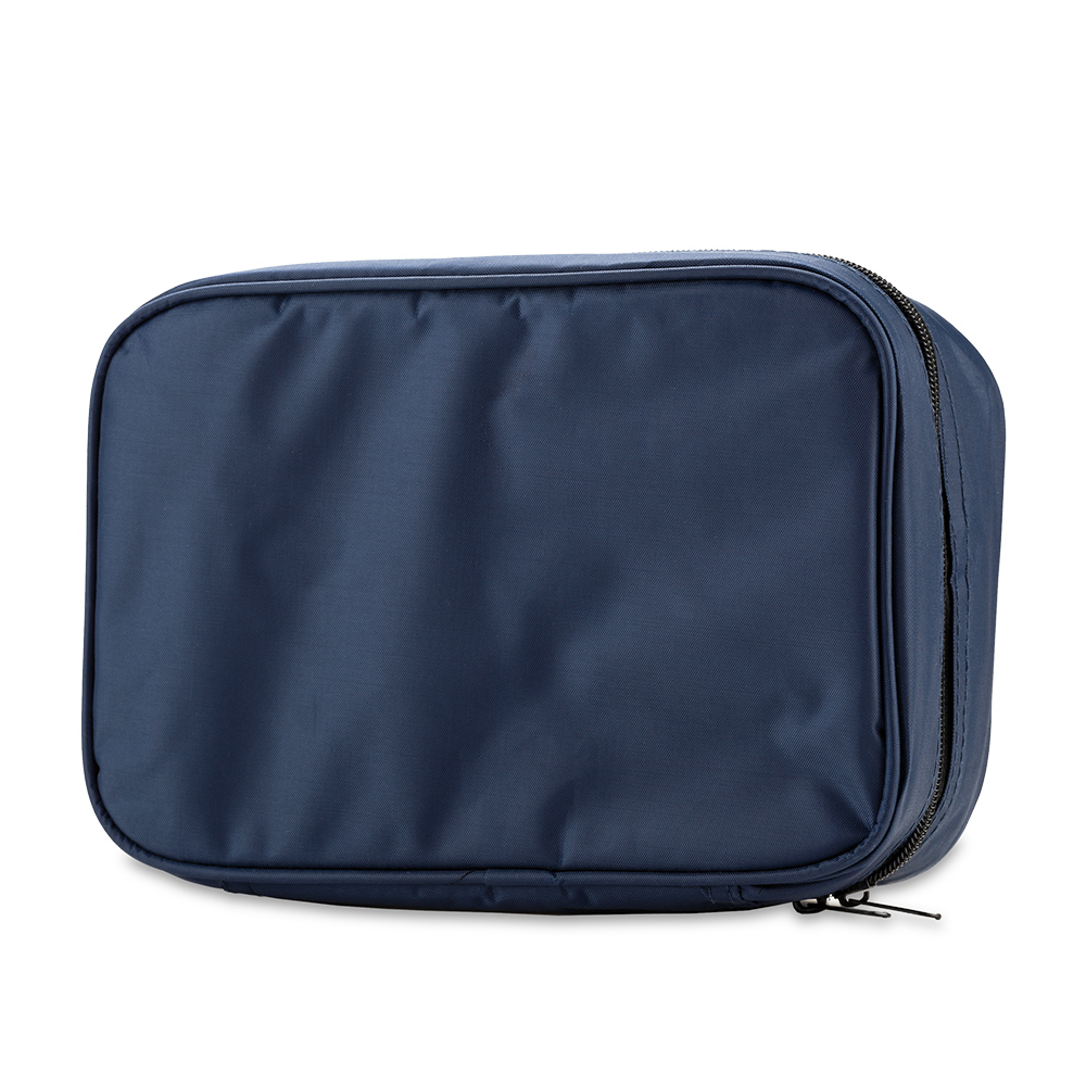 En lona poliéster con cierre cremallera. 4 organizadores interiores, 2 bolsillos internos con cremallera y 2 en malla,gancho para colgar.