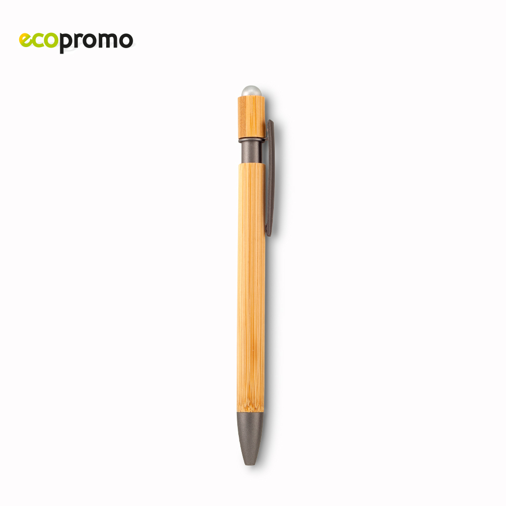 Bolígrafo en bambú con stylus. Mecanismo push y clip metálico.