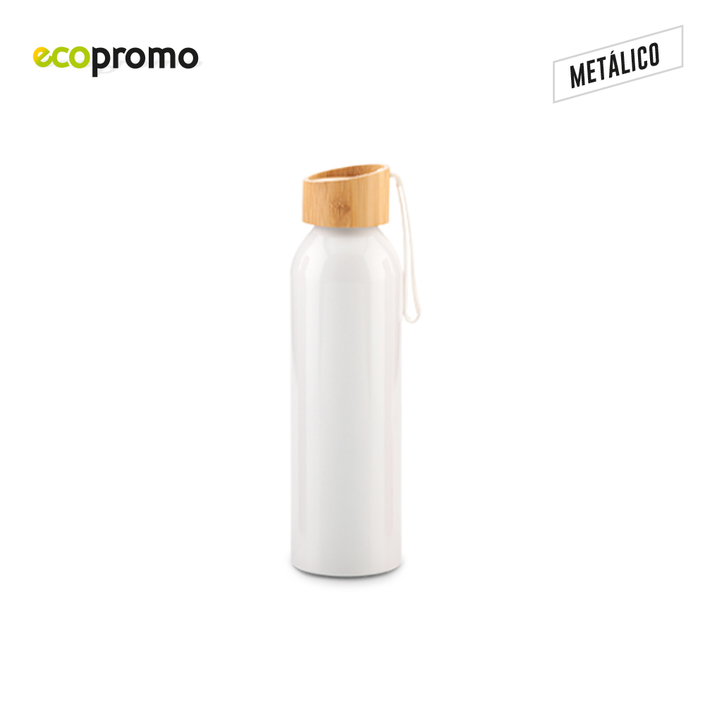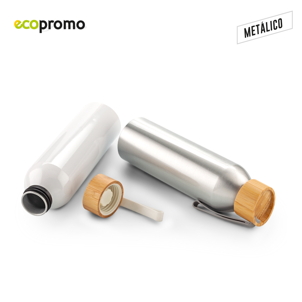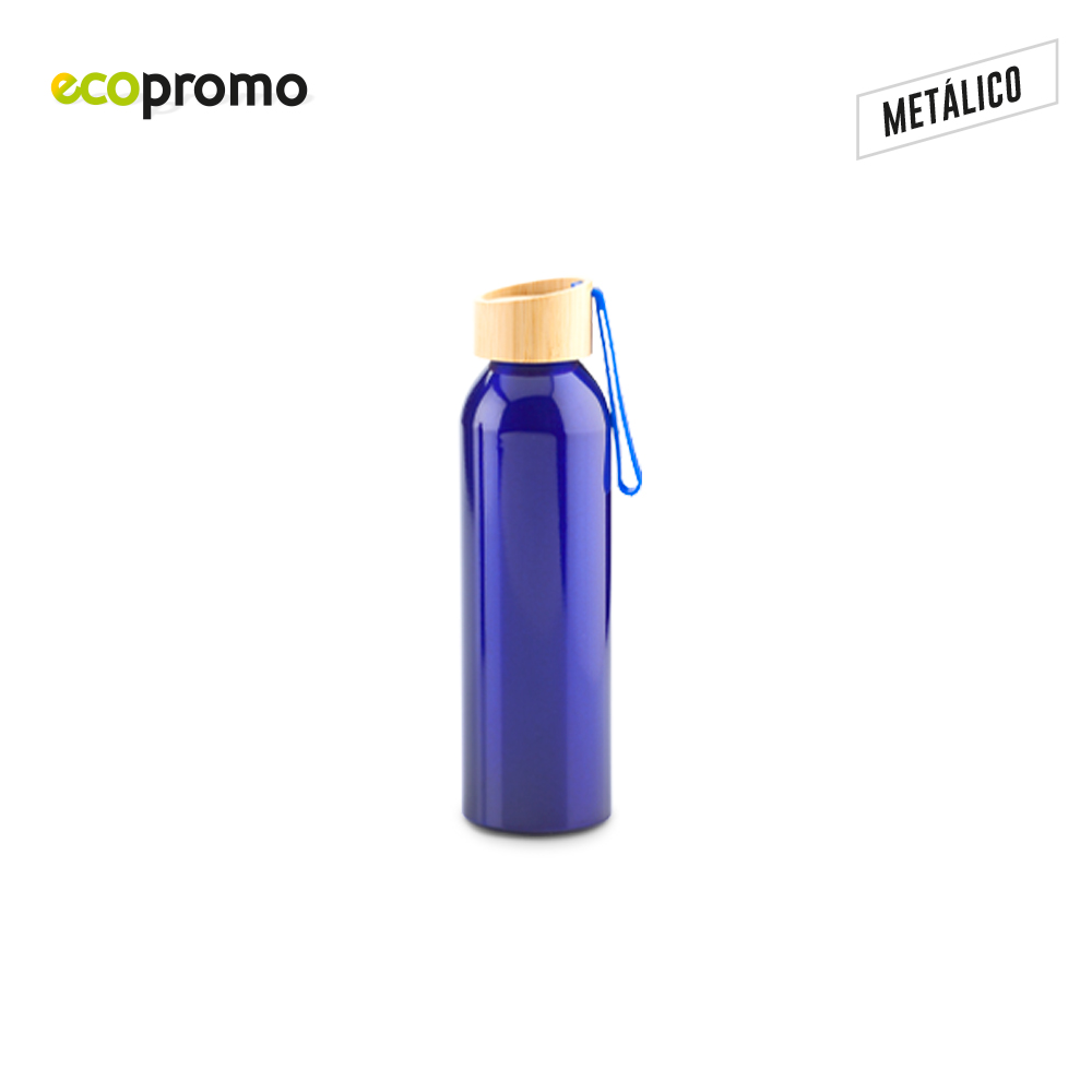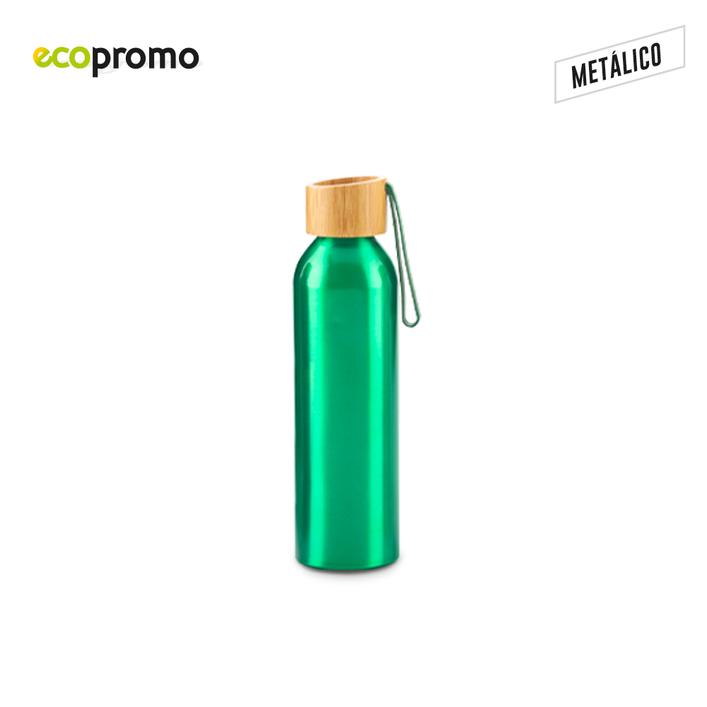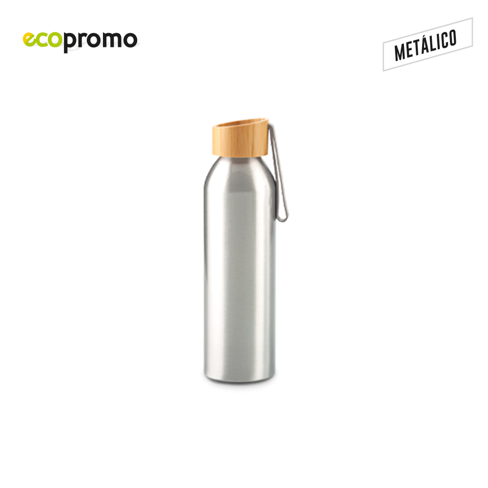 Botilito en aluminio con tapa en bambú y agarradera en caucho. Empaque caja individual.