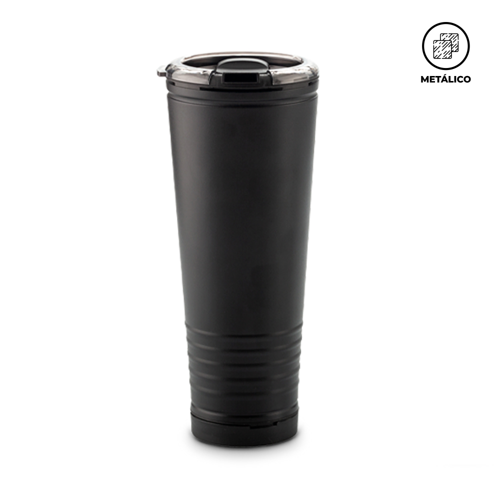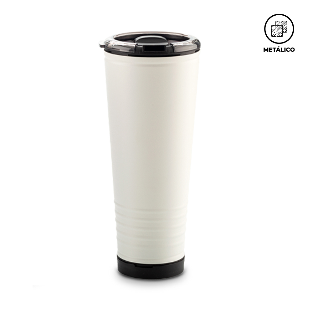Mug metálico con interior plástico. La tapa es una tapa protectora de cierre a presión, no es de seguridad la cual funciona también como corneta.