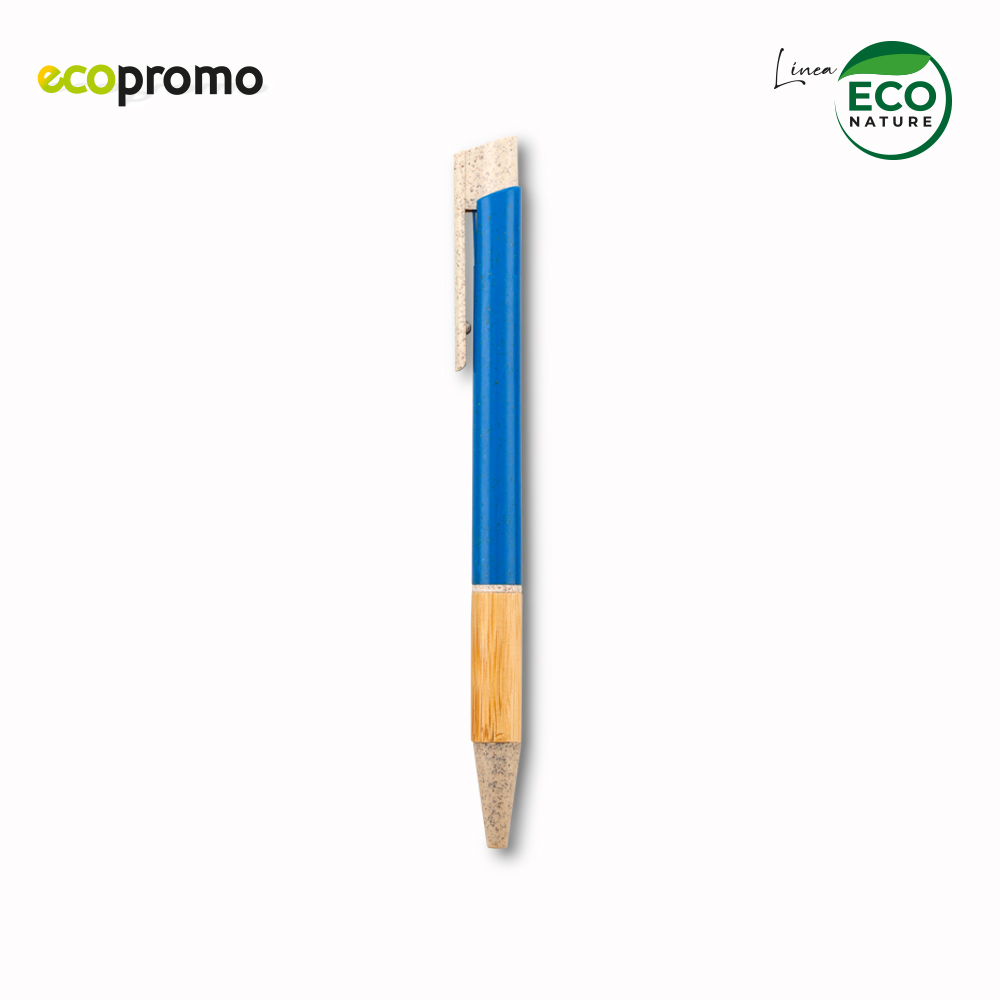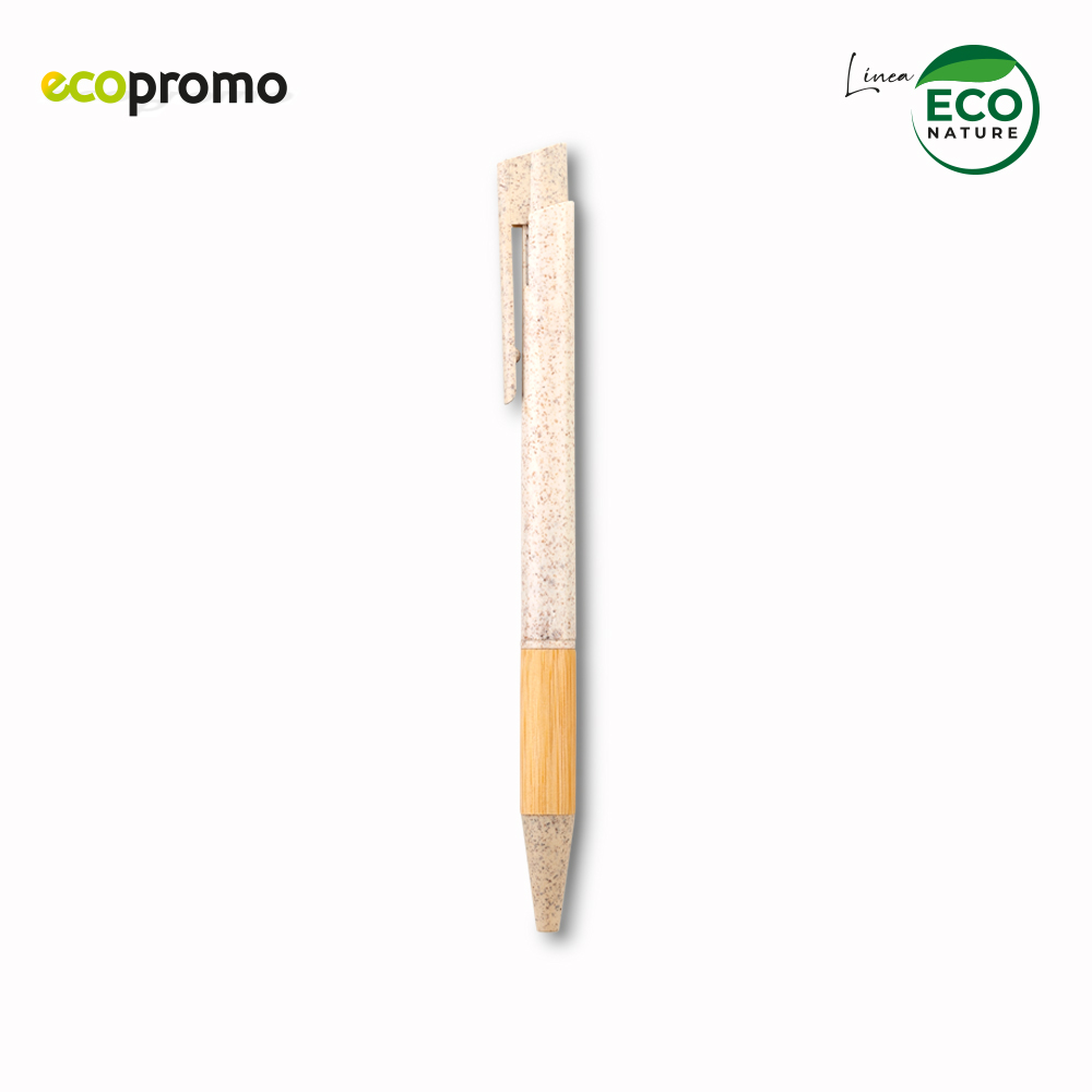 Bolígrafo plástico con grip de bambú. Mecanismo push. Mezcla con material ecológico en fibra de trigo (50%-60% aprox).El porcentaje de material ecológico tiene promedio de biodegradabilidad de 2-3 años después del fin de su vida útil.