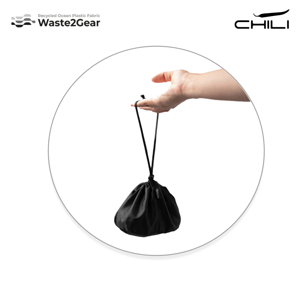 Morral backpack plegable en poliéster reciclado de residuos plásticos recuperados del océano. Dos bolsillos externos con cremallera y dos bolsillos laterales en malla. Incluye bolsa para guardarlo.